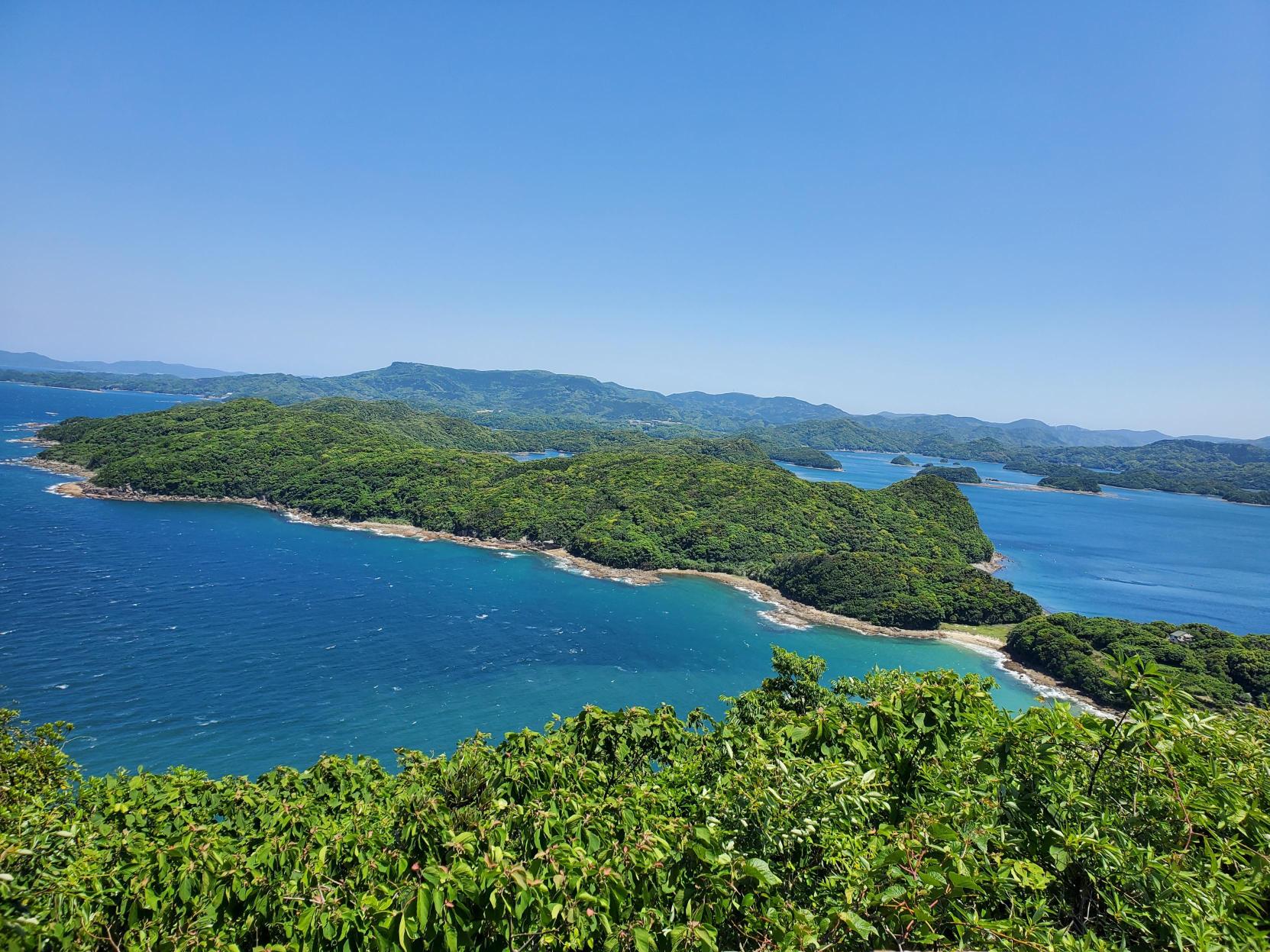 高島は、日本本土最西端に広がる大小208の島々からなる九十九島(くじゅうくしま)に含まれており、4つある有人島のうちの1島です。タツノオトシゴの形をした島で、港や集落は中部の尾がくびれた形になっている部分に集中しています。港から南へ徒歩約30分の場所に位置する「高島番岳」は九十九島八景と呼ばれる展望台の1つに数えられており、平戸や五島列島を近くに望むことができます。また、八景の中で、九十九島からの朝日が見られる展望台は高島番岳だけ。島には人工の海水浴場があり、シャワーも併設してあるため、気軽にマリンスポーツを楽しむことができます。1年を通して釣り客も多く、釣り人に大人気のスポットです。島民のほとんどは漁業に従事し、カマボコ・チクワ製造業や民間の真珠会社の養殖場があります。島内に生鮮食品を販売している商店はありませんが、週に1度移動スーパーが来るため、必要なものはそこで購入可能です。
