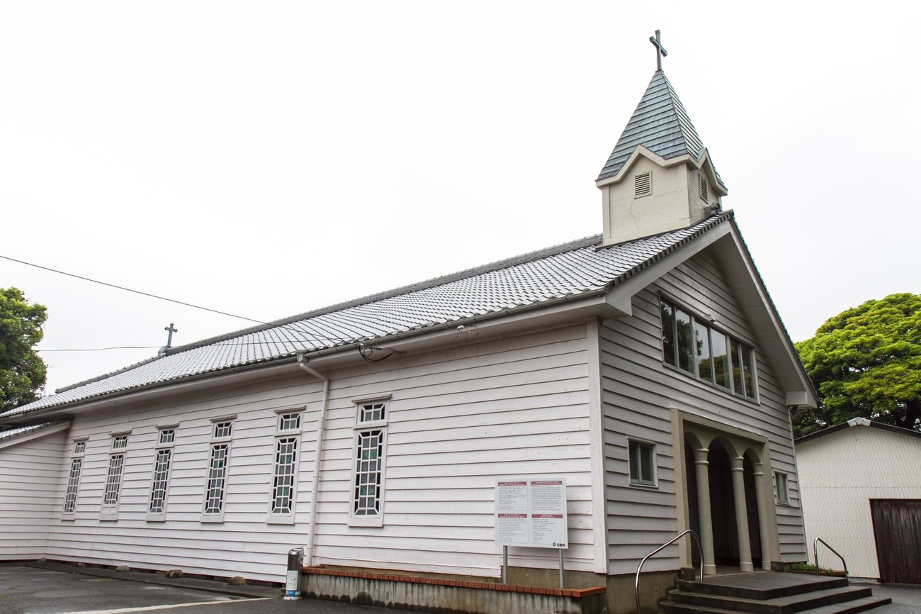 奈留島港から原付で20分ほど、山を越えた廃校そばの林の中に、「江上天主堂」はありました。周囲を木々に囲まれ、近くの小川を流れる水の音が絶えず聞こえてきます。白かと思った壁は近づくとクリーム色でした。水色の窓が掛けられた小さな木造教会は、物語の中から出てきたような姿です。この教会も鉄川与助の設計・施工で、1918年に建立されました。林や川がある湿気の多い場所で、100年もこの姿を保っていることに驚くばかりです。