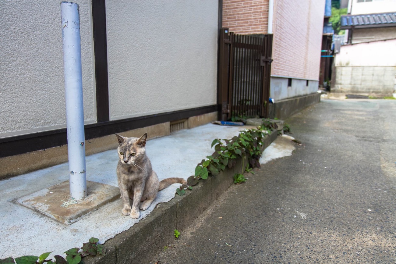 メインの通りから1本内側の道はちょっとしたたまり場になっていて、こちらが立ち止まると、わざわざ寄ってきて体をすりつけてくる子もいます。別の路地では、民家の開け放たれた戸の前にネコたちが陣取っているのが見えます。しばらくすると、さばいた魚のアラが中からぽいっと投げられ、ネコたちは喜んでくわえて去っていきました。いつもこうやってエサをもらっているんだろうな、と思えるひとコマでした。