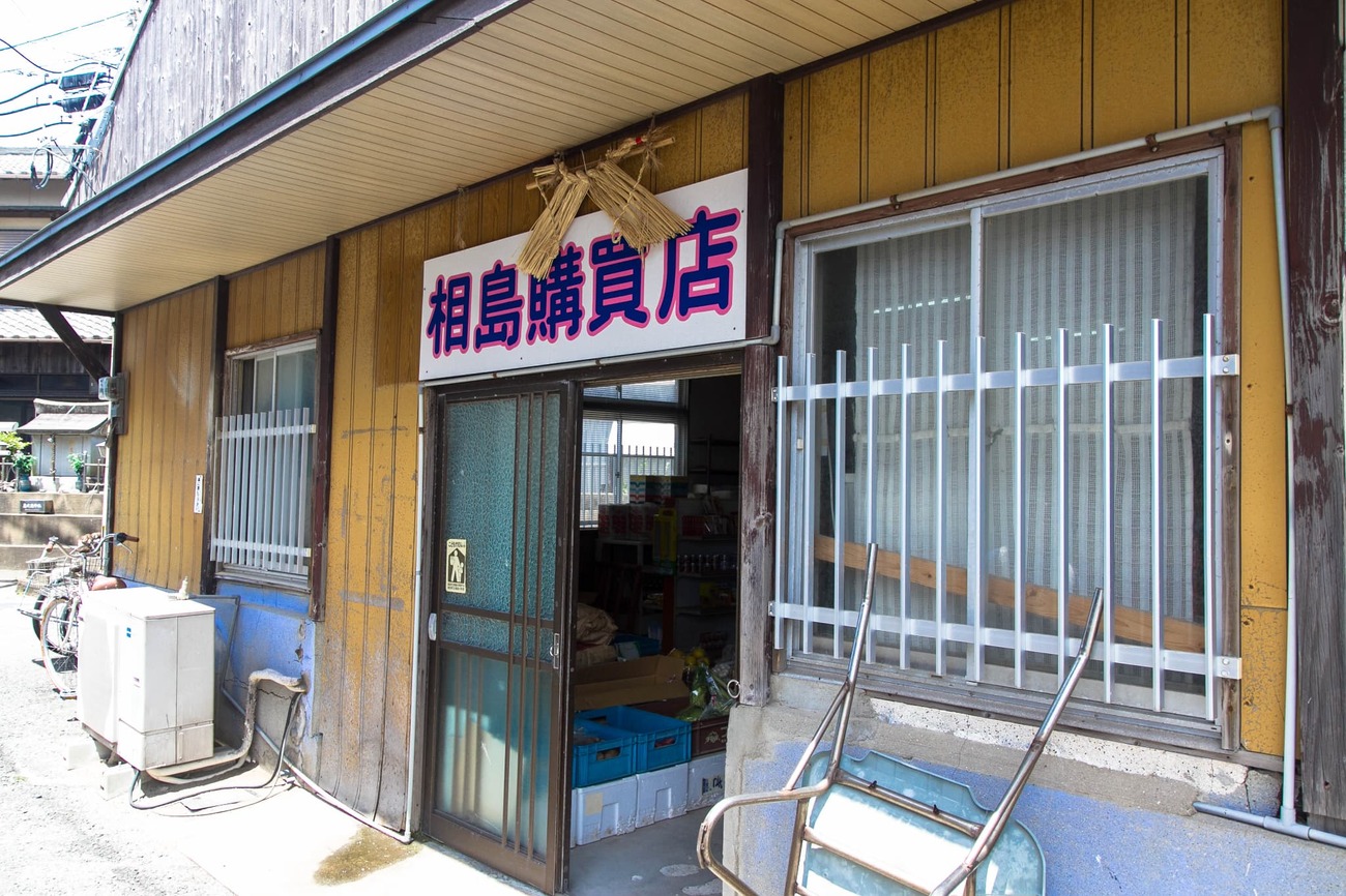甘夏を堪能していると、そばの看板に「愛の島(※)名物さわらのつみれ いかたこ入り 美味しいよ 1串200円」の文字が目に入ってきました。せっかくなので相島の幸をいただくことに。店の奥に声をかけると、中ではウニの殻むきをしている最中。漁で揚がったものをさばいたり、つみれやかき氷を売っているお店のようでした。甘夏のカゴの下には、いつの間にかネコが休んでいます。