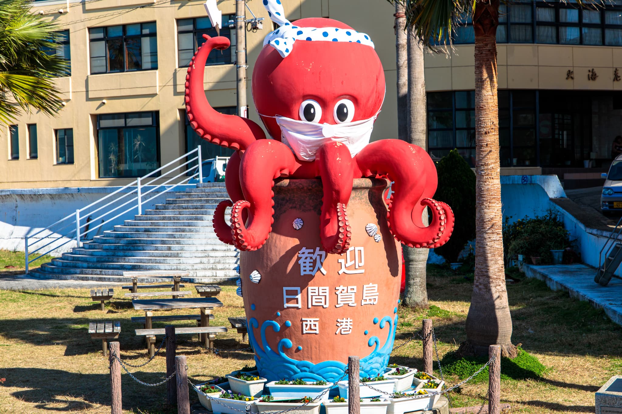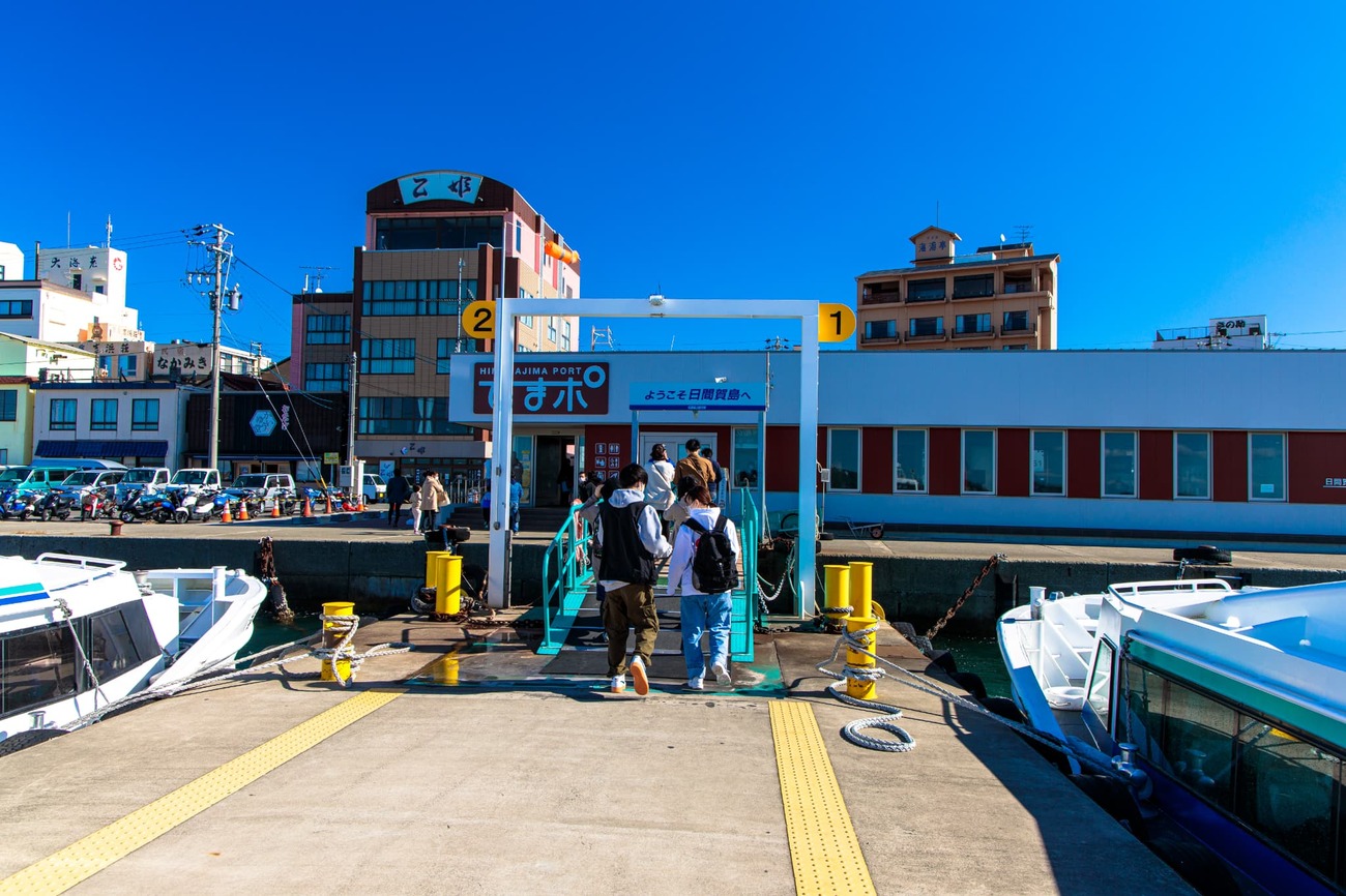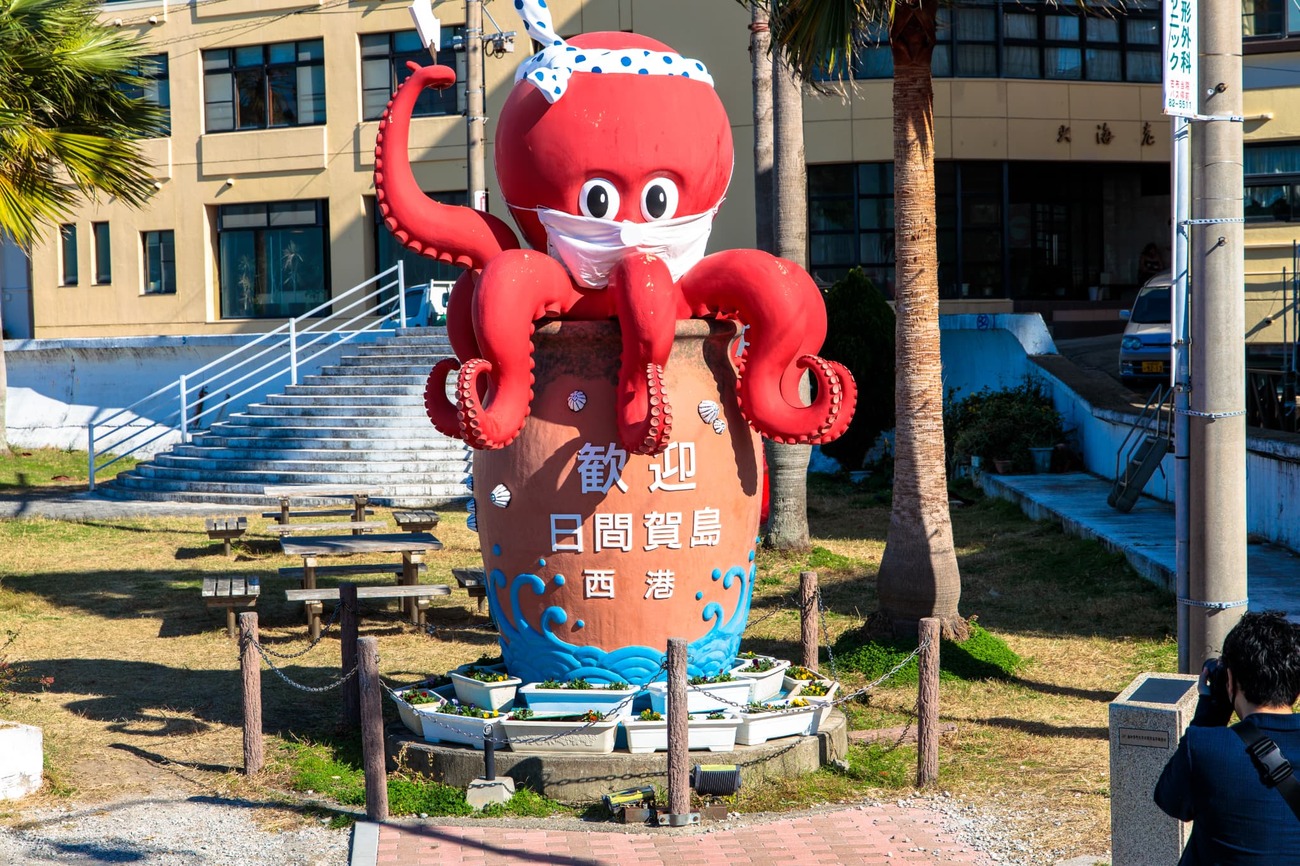 東京駅から新幹線と名鉄を乗り継ぎ、約2時間半で知多半島の先の河和駅へ。11時5分発の高速船に乗り込み、デッキで風に吹かれること20分。最初の目的地、日間賀島の西港に到着です。船を降りて驚いたのは、その都会ぶりでした。港には「ビル」と言っていい立派な建物が並び、巨大なタコのモニュメントが出迎えてくれます。