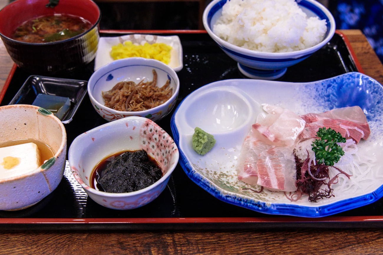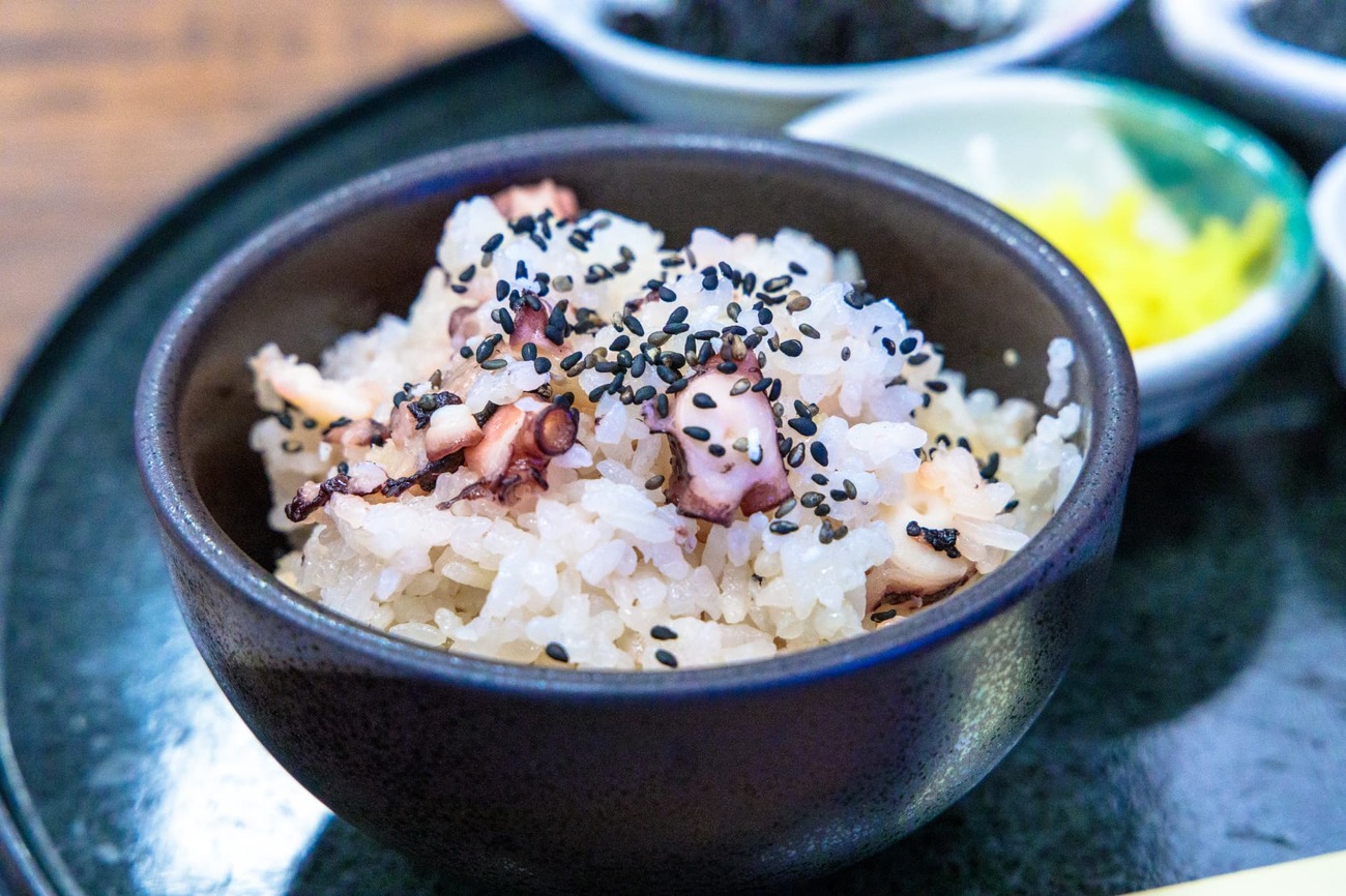 まずは腹ごしらえと、ドラマ「孤独のグルメ」のロケ地にもなった食堂「乙姫」へ。開店直後にも関わらず、港まで伸びる行列に目を疑いましたが、意を決して並びます。回転は思ったより早くて20分ほどで入店できました。注文したのは、井之頭五郎も食べた「たこめし」。素朴な味わいで噛むほどに旨味が広がります。連れが頼んだ刺身定食のタイとヒラマサは、ぶりんぶりんの歯ごたえで、本当に美味。自分も刺身にすればよかったと唸るほどで、旅の初手から胃袋を掴まれました。