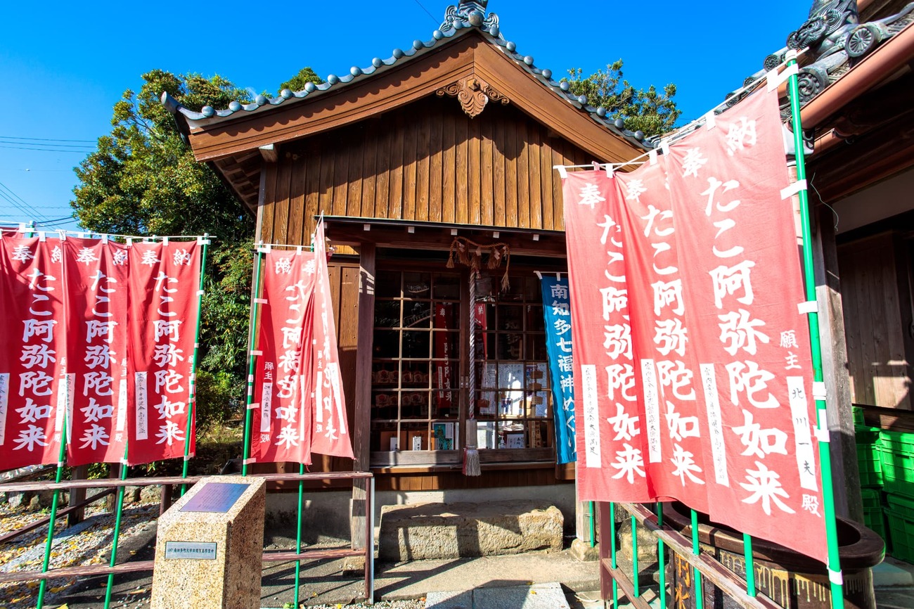 集落にはお寺が多く点在しています。「安楽寺」には、海から引き上げられた時に大ダコが守るように抱きついていた阿弥陀如来が、「たこ阿弥陀」として祀られています。タコの吸盤にあやかり「良縁を吸い寄せる」ご利益があるとか。絵馬掛けにはお笑い芸人の濱口優さんの願い事と、その後の「かないました!」というお礼参りのサインがあり、その霊験あらたかさに思わず笑みがこぼれました。また、海沿いの「大光院」は知多四国八十八ヶ所の第37番札所で、右手に鯖を持ったユニークな「鯖大師」像もありました。観光客で賑わう表通りとは違い、静かな信仰の空気が流れています。