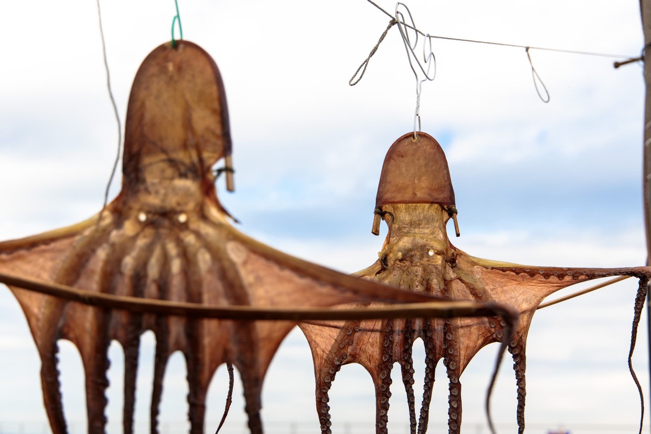 翌朝、宿をチェックアウトしようとすると、女将さんが厨房から大きな「干しだこ」を持って出てきました。「これ、外に干すから手伝って」まさかのお手伝いです。渡されたタコには、針金ハンガーを加工したフックが掛けられていました。女将さんと並んで天日干しにする作業。冬の風物詩である干だこ作りを少しだけ体験させてもらい、なんだか島の一員になれたような気持ちになりました。干しだこは新年に氏神様にお供えし、無病息災や大漁を祈願するそうです。