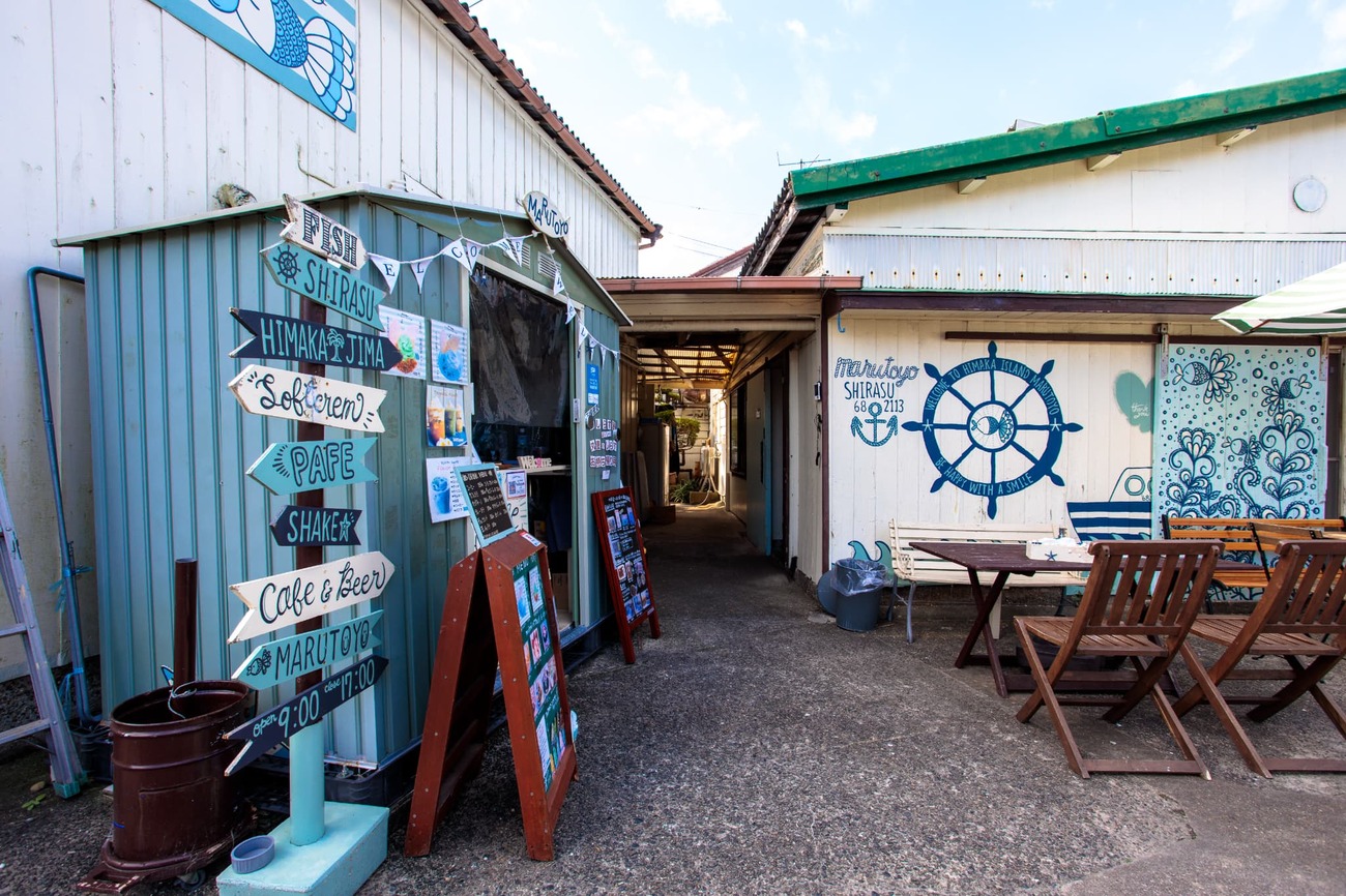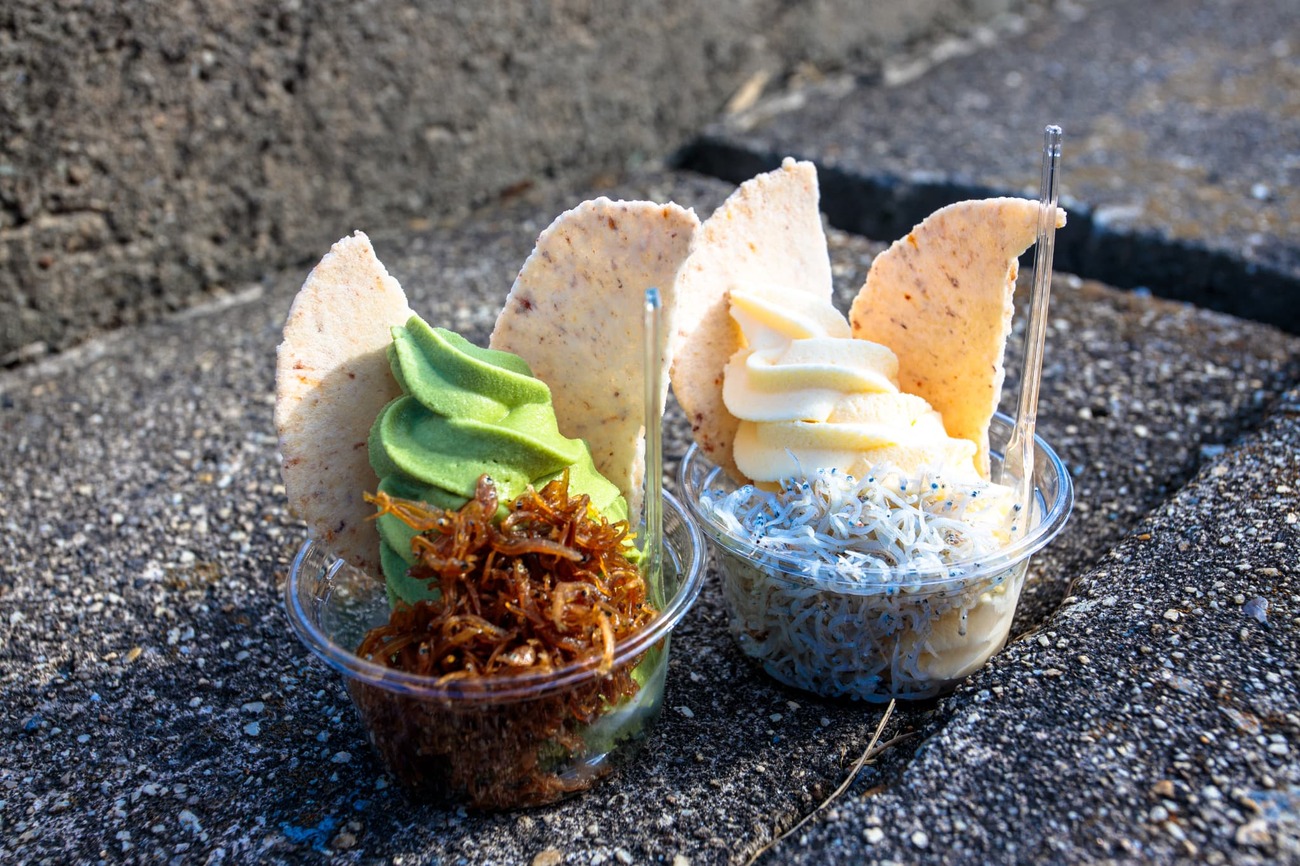 島を離れる前に、昨日看板を見かけて気になっていた「島しらすソフト」に挑戦しました。しらす漁と加工をしている「丸豊」さんの直売所で売られているそれは、ソフトクリームに釜揚げしらすがトッピングされたもの。恐る恐る口に運ぶと、クリームの甘さにしらすの塩気が絶妙なアクセントになり、予想以上の美味しさ。新鮮なしらすだからこそ、くさみがなくスイーツとして成立するのでしょう。しらすの佃煮を使った佃煮抹茶ソフトもバランス抜群で美味しかったです。
