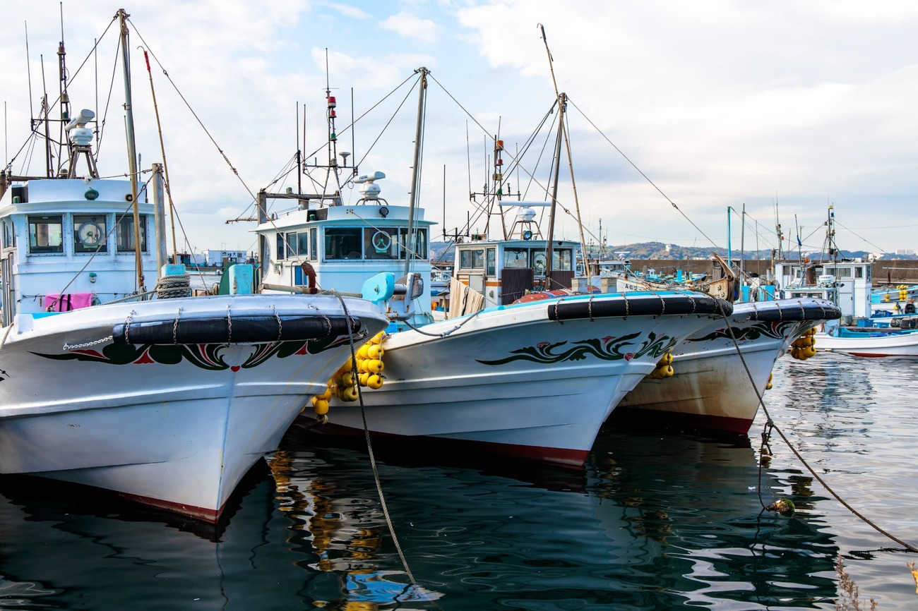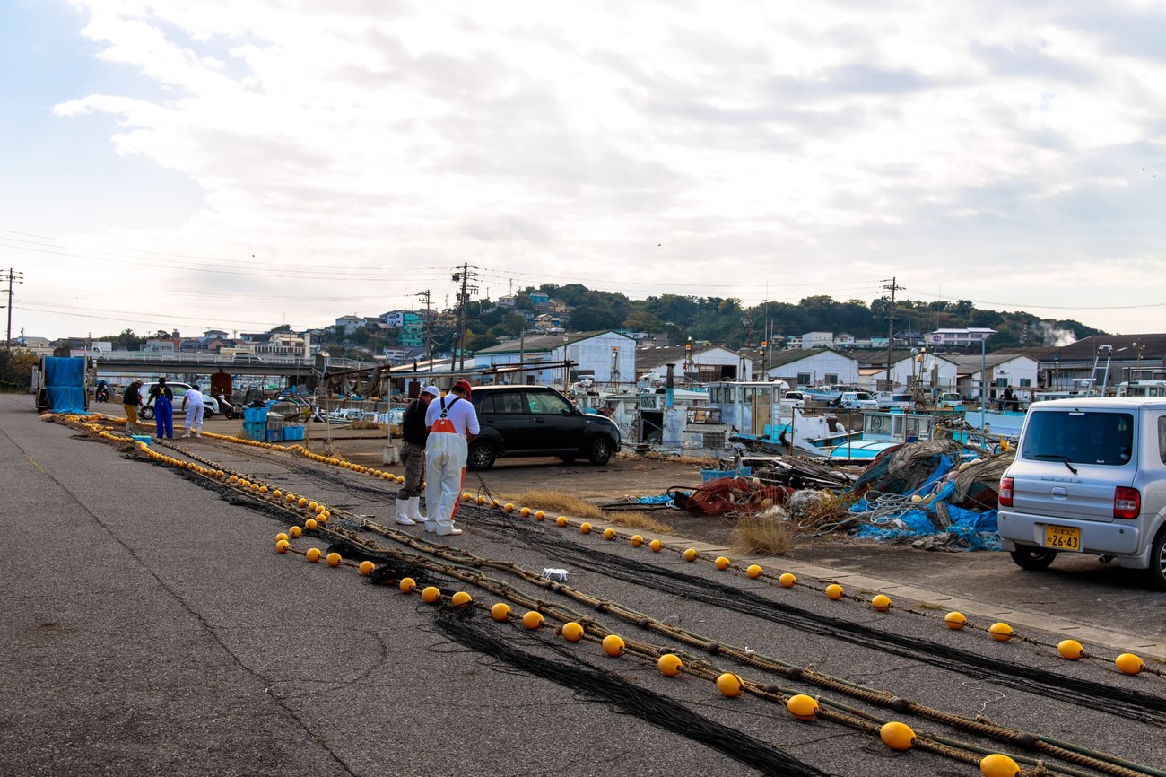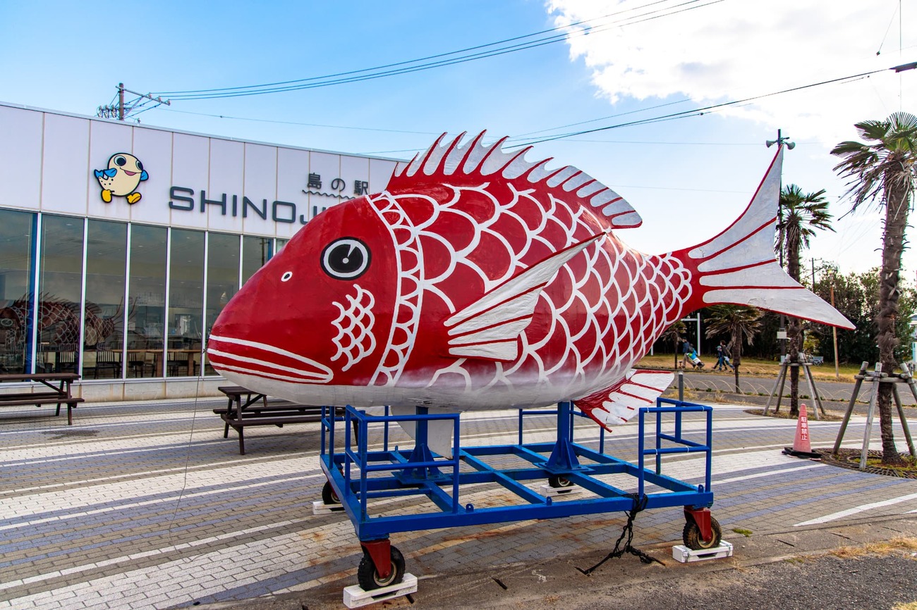 日間賀島の東港から高速船でわずか10分、お隣の「篠島」へ移動します。港に降り立つと、こちらは巨大な「タイ」のオブジェがお出迎え。そして何より目を引いたのは、港を埋め尽くさんばかりの漁船の数です。よく見ると、船の舳先には独特の唐草模様が描かれています。島の方に聞くと、篠島の造船所で作られた船特有の模様で、しらす漁をする3隻のチームで同じ模様に統一されているのだとか。日間賀島にも漁船がたくさん停泊していましたが、篠島からは「漁師の島」という気概を感じます。漁港では漁網の手入れや船の整備をしている漁師もいて、活気がありました。