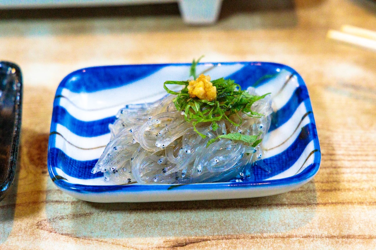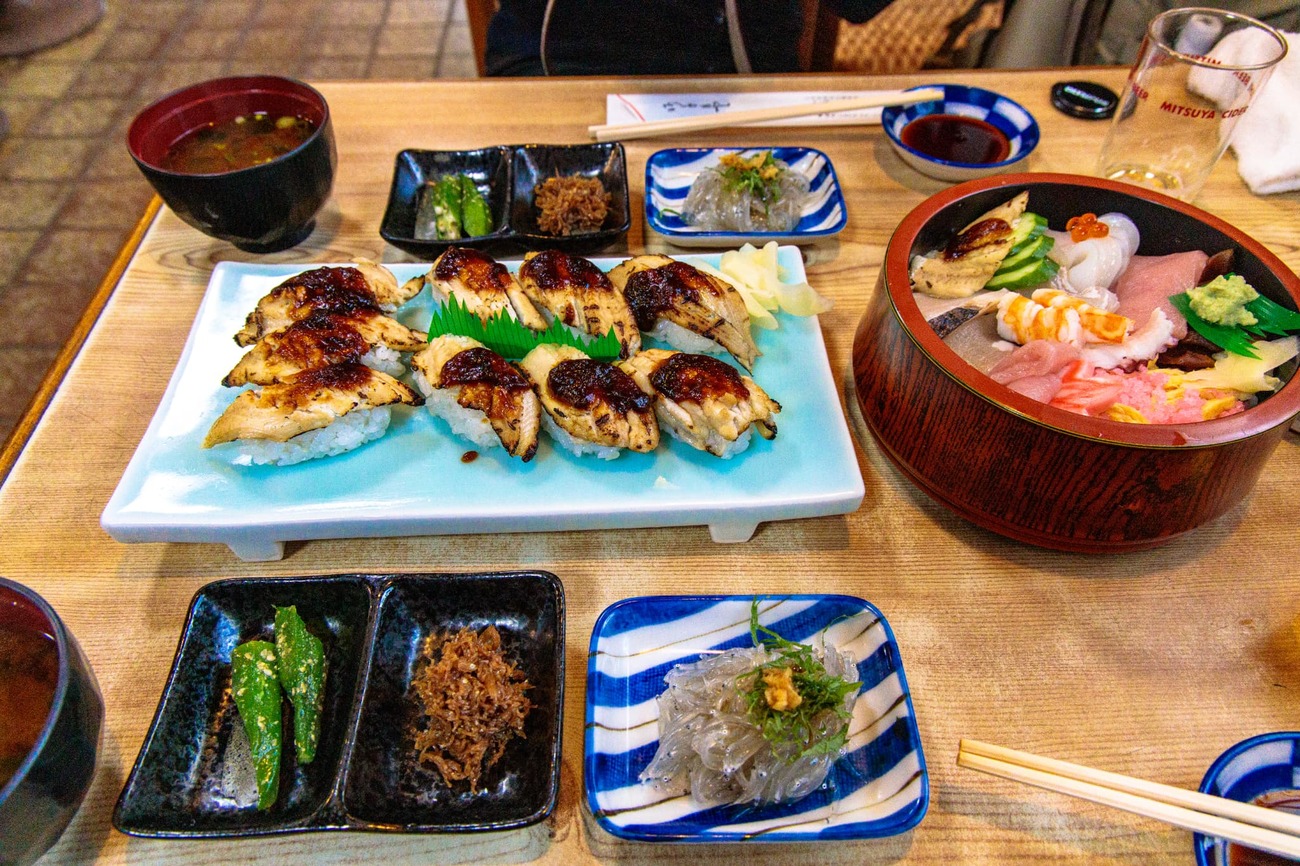 昼食に入った「城寿司」では、嬉しい「島の洗礼」を受けました。店内に他にお客がおらず不安になりましたが、注文を待つ間に大将が「これ食べて待ってて」とタイラガイのヒモの煮付けをサービスしてくれました。お願いしたアナゴの握りは柔らかくて甘めのタレが抜群で、ちらし寿司は篠島の海の幸がぎっしり。「美味い!」と声に出しながら食べていたら気を良くしたのか、大将から「今朝久しぶりにしらすが揚がったから」と、ピカピカの生しらすに釜揚げしらすまで小皿に盛って出してくれました。「島のしらすは大きいから釜揚げでもふっくらしてるんだ」とのこと。