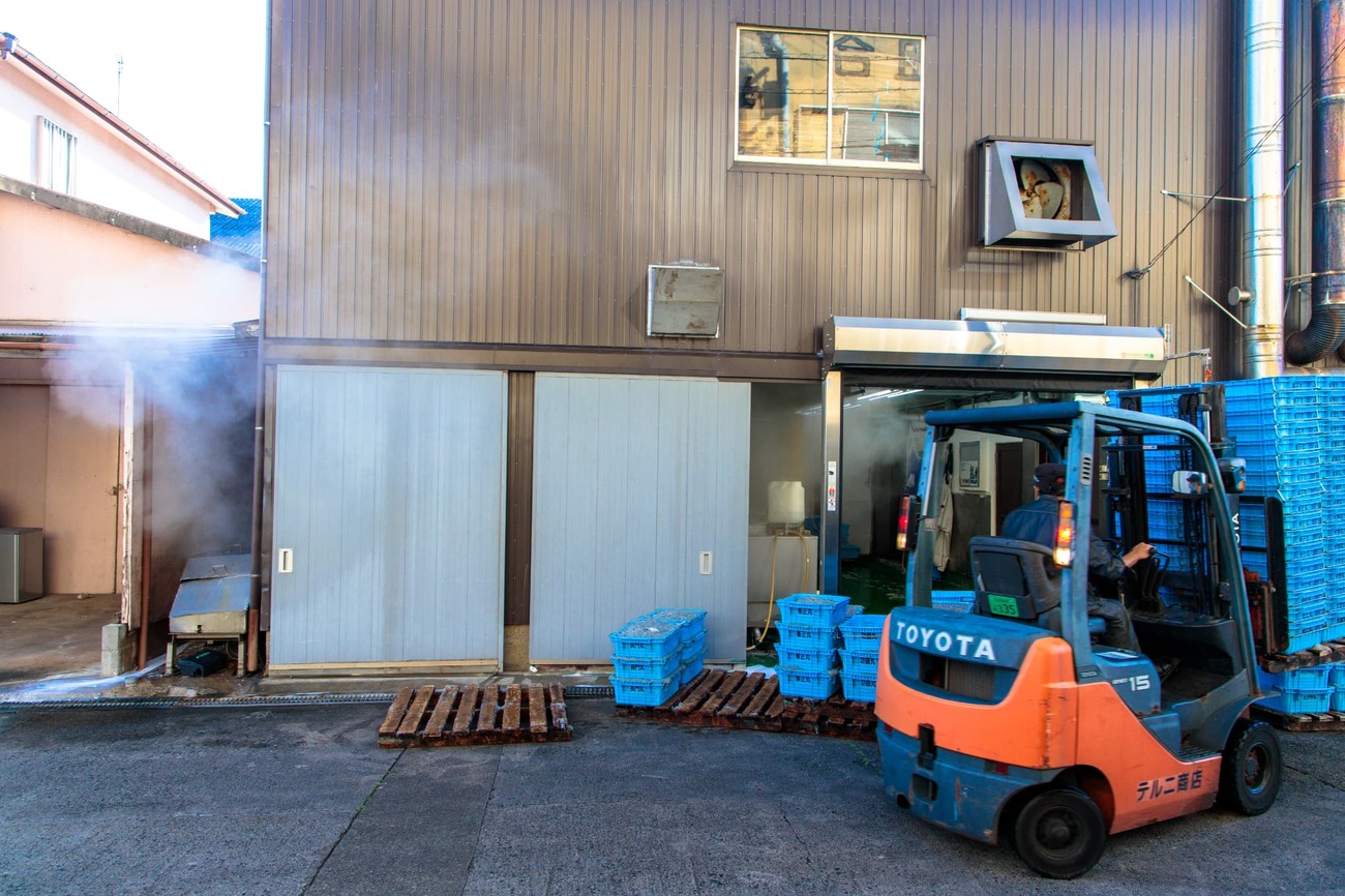 喜んで食べていると「しらす加工場見ていく?」とまさかの提案。お昼の最後の客だったようで、お店を閉めて大将の運転で知り合いの加工場へ見学に連れて行ってくれました。加工場にはカゴに入った大量の生しらす。フォークリフトが行き交い、しらすをお湯に潜らせるたびに湯気が立ち昇る加工場。港に並ぶ漁船が獲ってきた命を、こうやって美味しく加工している現場を肌で感じることができました。