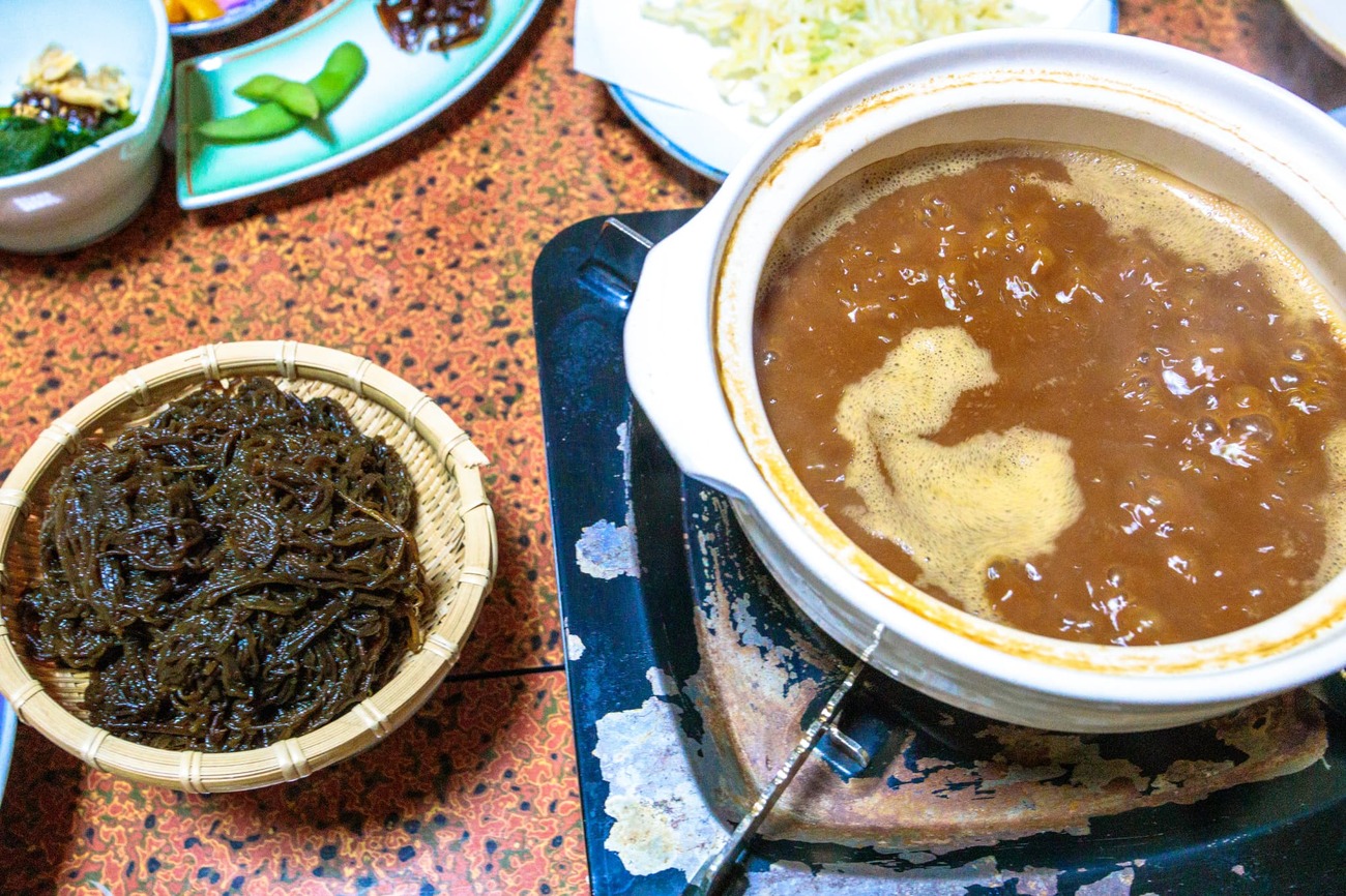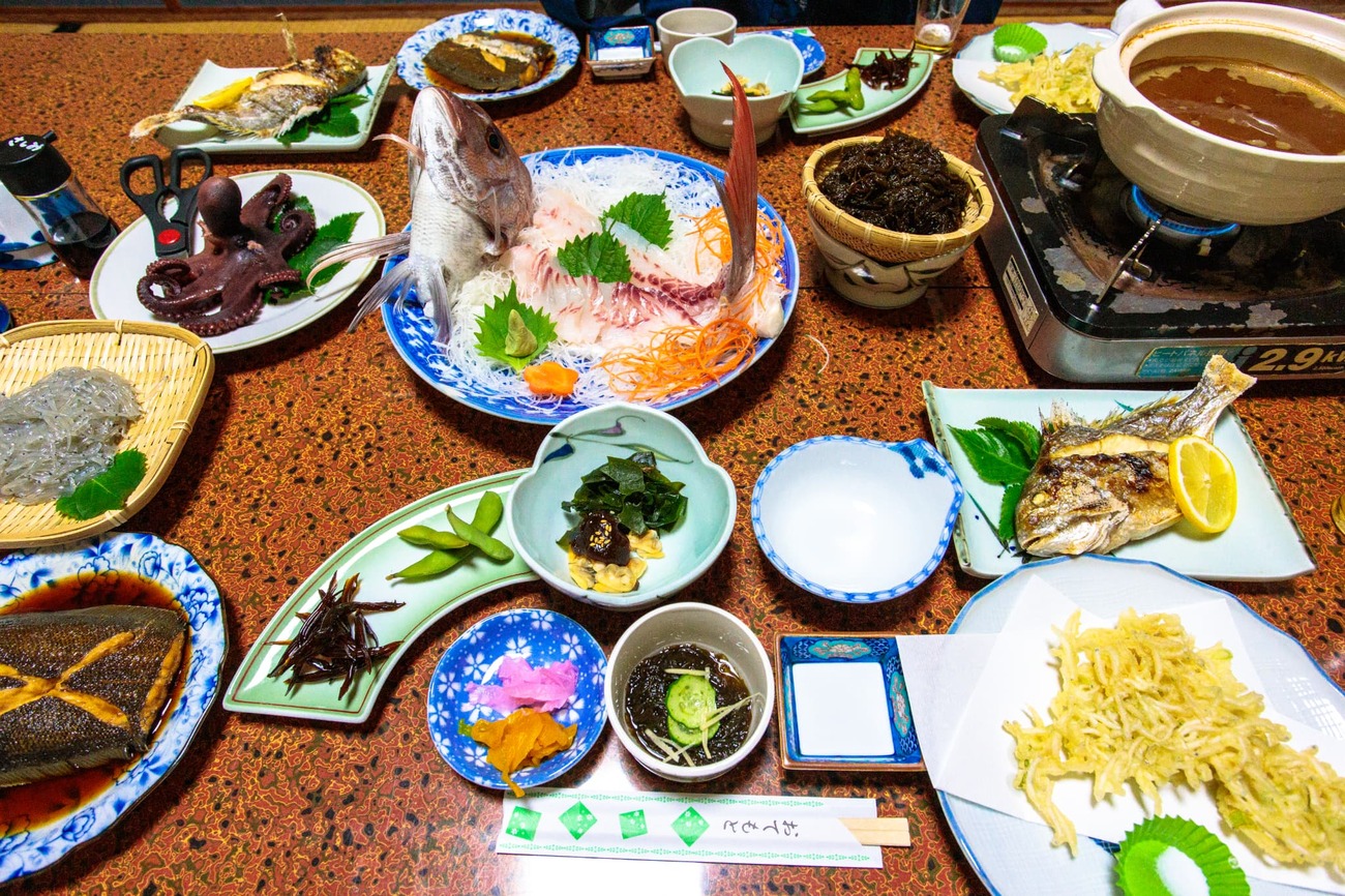 夕日を見てから宿に戻り、夕食の時間です。ここでも漁師町の洗礼が待っていました。テーブルに乗り切らないほどの海の幸がずらり。タイの姿造り、タコの姿煮、舌平目の煮魚、メダイの塩焼き、生しらすはざるにどっさり。しらすの天ぷらまであります。驚いたのは「もずくの味噌しゃぶ」です。「島ではなんでも味噌のつゆに入れて食べるんです」とご主人。太く歯ごたえのあるもずくを赤味噌の出汁にくぐらせて食べると、これが絶品! 「こんなに美味しいのに、全部は食べきれない……」と嬉しい悲鳴を上げながら、島の幸をお腹に入れていきます。城寿司の大将からは「ここの宿のご主人も漁師だから」と聞いていましたが、まさに三河湾の豊かさを実感する夕飯でした。