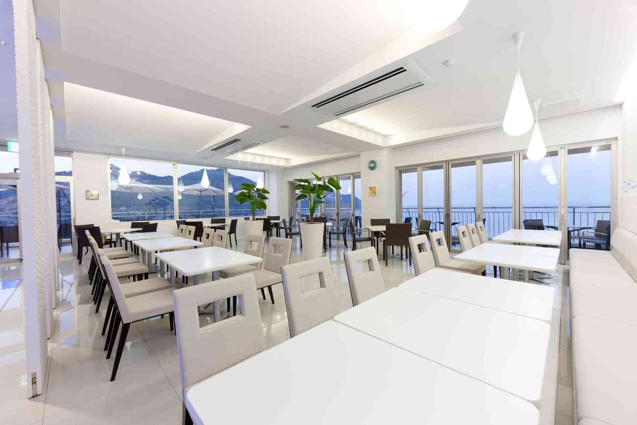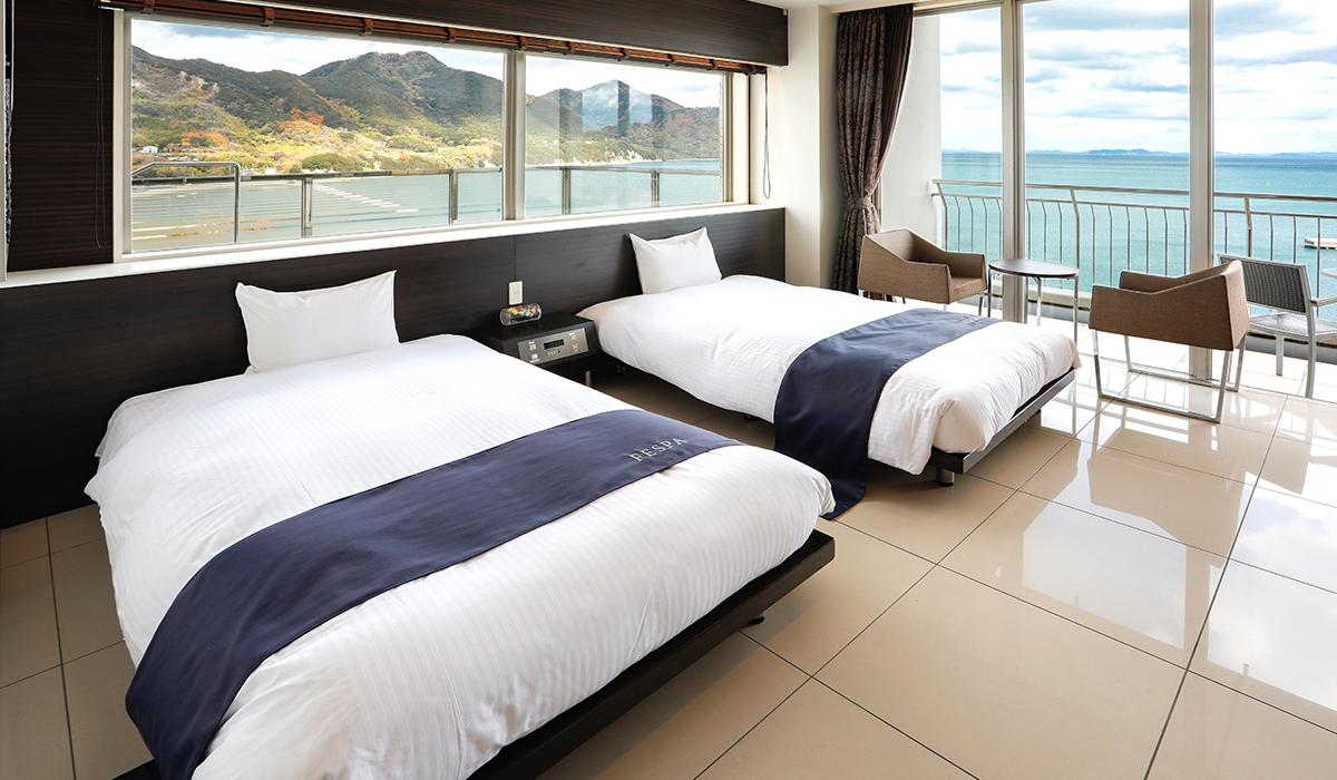 フェスパが建つのは、瀬戸内海を見渡す高台です。客室やレストランからは、多くの島々が浮かぶ瀬戸内らしい景色が広がります。朝は静かな海を眺めながら一日が始まり、夕方には島影がゆっくりと色を変えていく。そんな風景を眺めながら過ごす時間は、都市での忙しい日常とは少し違うリズムを感じさせてくれます。瀬戸内の景色に包まれながら、島ならではのゆったりとした時間を味わうことができる場所です。