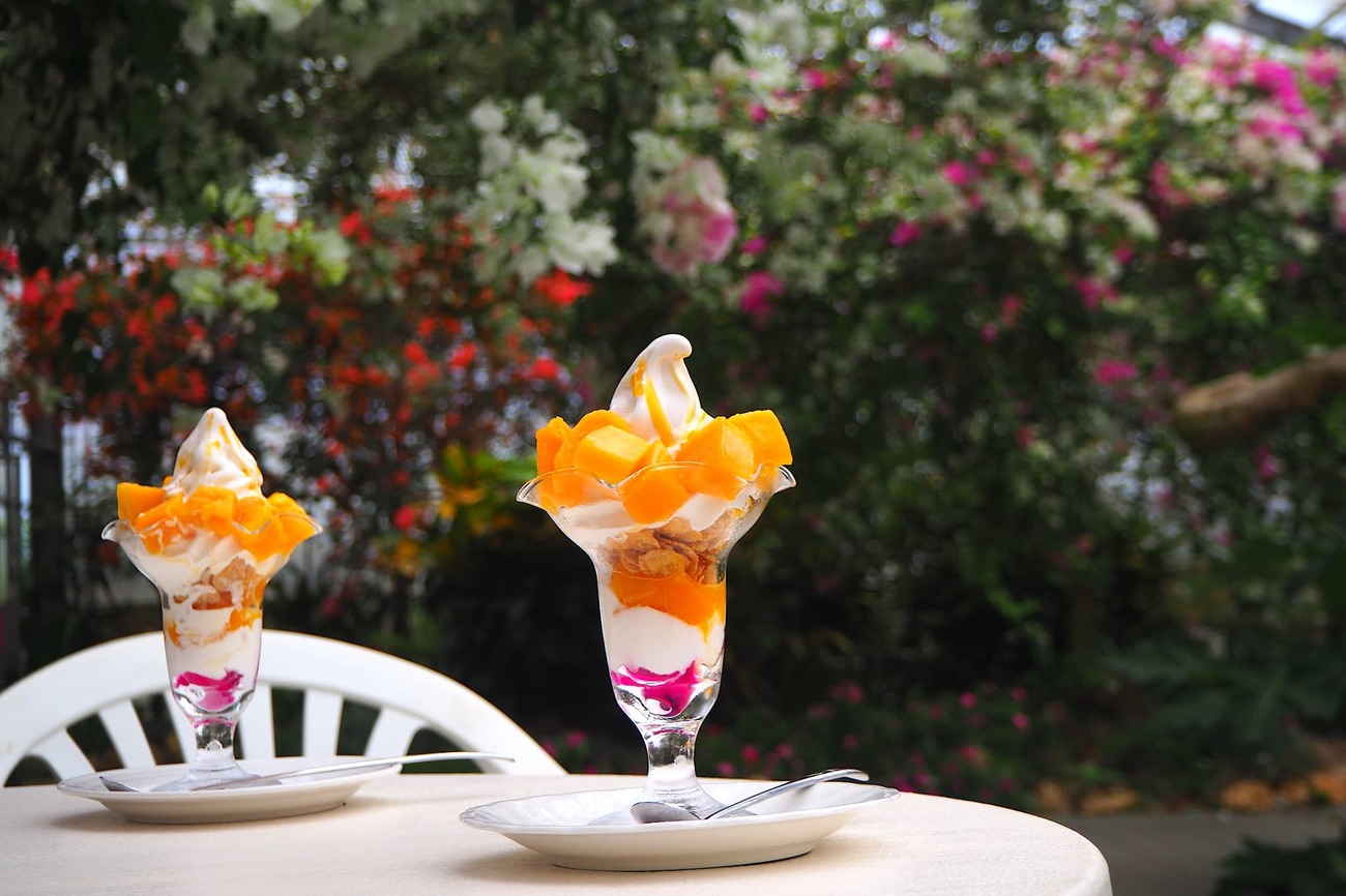 雨の宮古島でまず訪れたいのが、「ユートピアファーム宮古島」です。園内に足を踏み入れると、一年中南国の空気が漂うトロピカルな風景が目の前に広がります。併設のパーラーには、ドラゴンフルーツやパッションフルーツなど、宮古島産フルーツを使ったスイーツがずらり。迷った末に選んだのは、マンゴーパフェでした。濃厚なのに重たさはなく、香りも豊かで、喉に染み渡る味わいです。なかでも印象的だったのは、世界各地から集められたブーゲンビレア。満開の時期には、目の高さや頭上まで花が咲き広がり、花に包まれるような空間に。天気に左右されるどころか、むしろしっとりとした情緒の中で、雨さえも心地よく感じられるスポットでした。3月から5月には美しいヒスイカズラの花も楽しむことができ、訪れる季節ごとに違った魅力に出会えます。