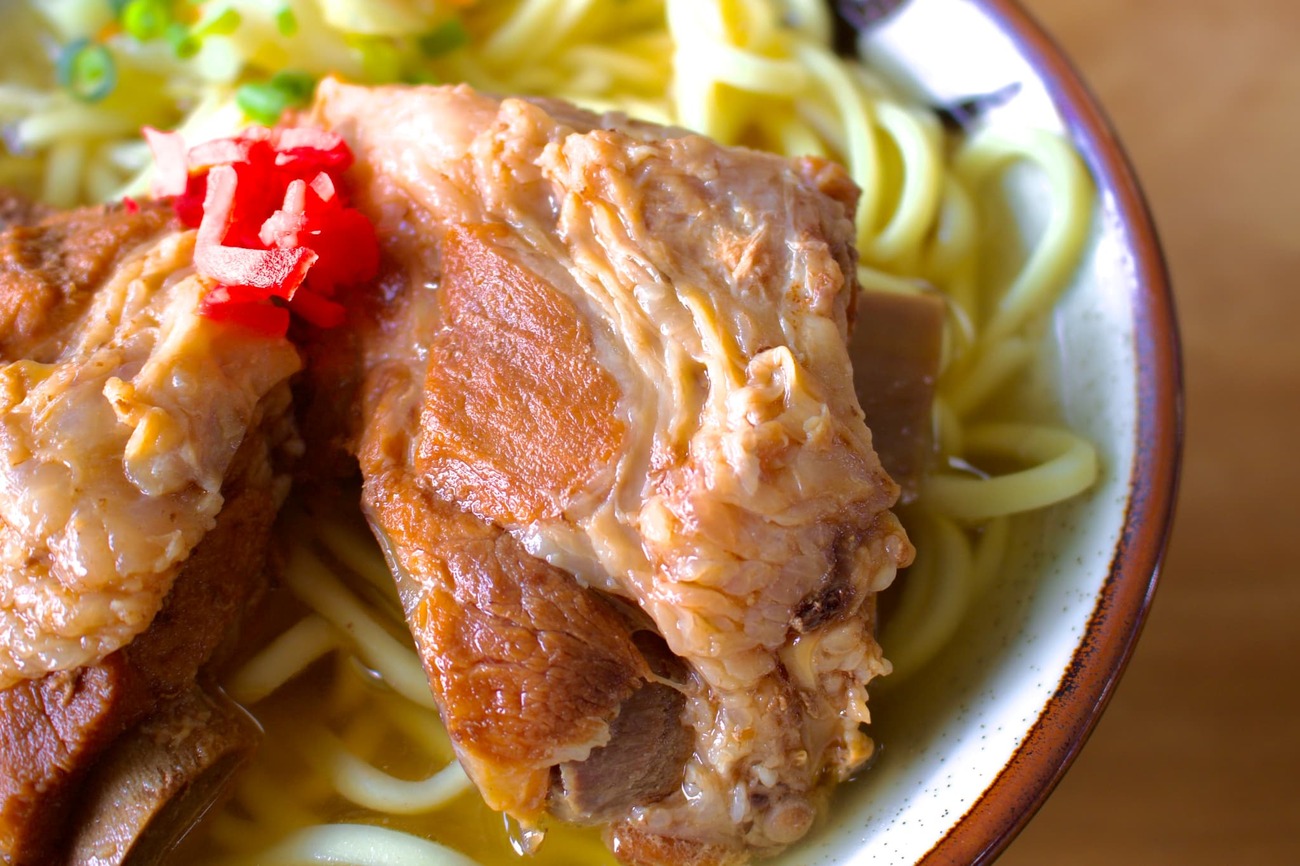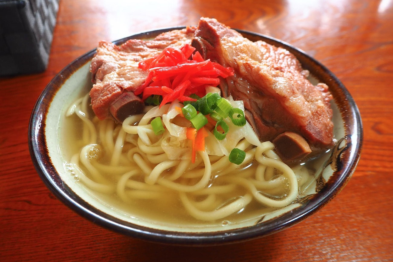 雨の日は、無理に動き回らず、食に集中するのも旅の楽しみ方のひとつ。中でもイチオシは、宮古そばの名店「丸吉食堂」です。宮古そばは沖縄そばとは少し異なり、細めのストレート麺とあっさりしたスープが特徴。私が注文したのは、看板メニューのソーキそばです。大きなブロック状のソーキがゴロゴロと入っています。これがデフォルトというのだから驚きです。スープは最初はあっさりとしていますが、食べ進めるうちにニンニクとソーキのタレの風味がじわじわ広がります。鰹と豚の旨みをベースに、しっかりした味わいがあるのに重たくならない、絶妙なバランスです。麺は中細のストレートでコシがあり、すすり心地も抜群。甘辛く味が染みたソーキは食べ応え満点です。さらに添えられた野菜が、濃厚なソーキとのバランスを整えてくれるのも印象的。雨の日に、ゆっくり味わいたくなる一杯でした。