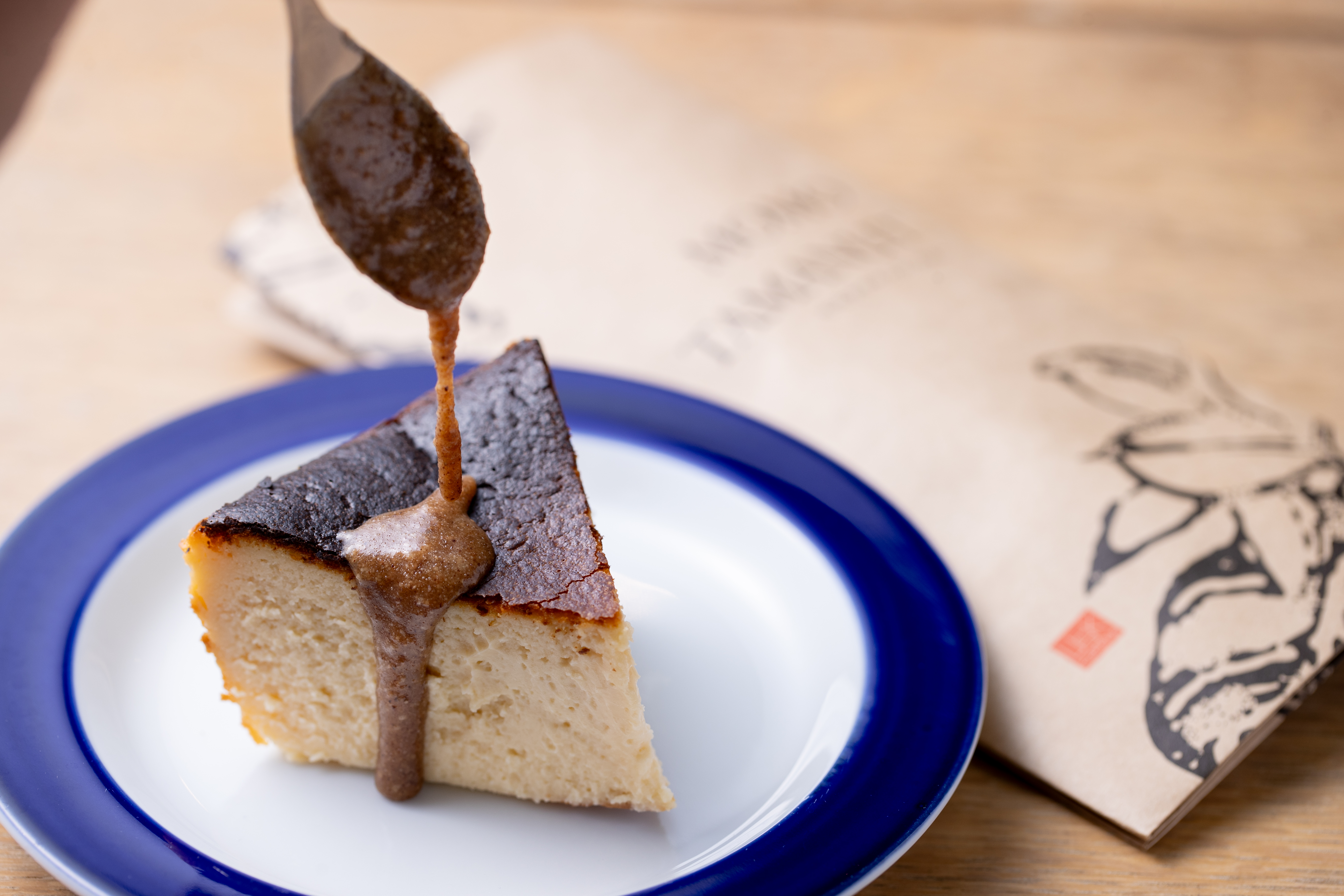 「バスクチーズケーキのモモタマナメイプルソースがけ」