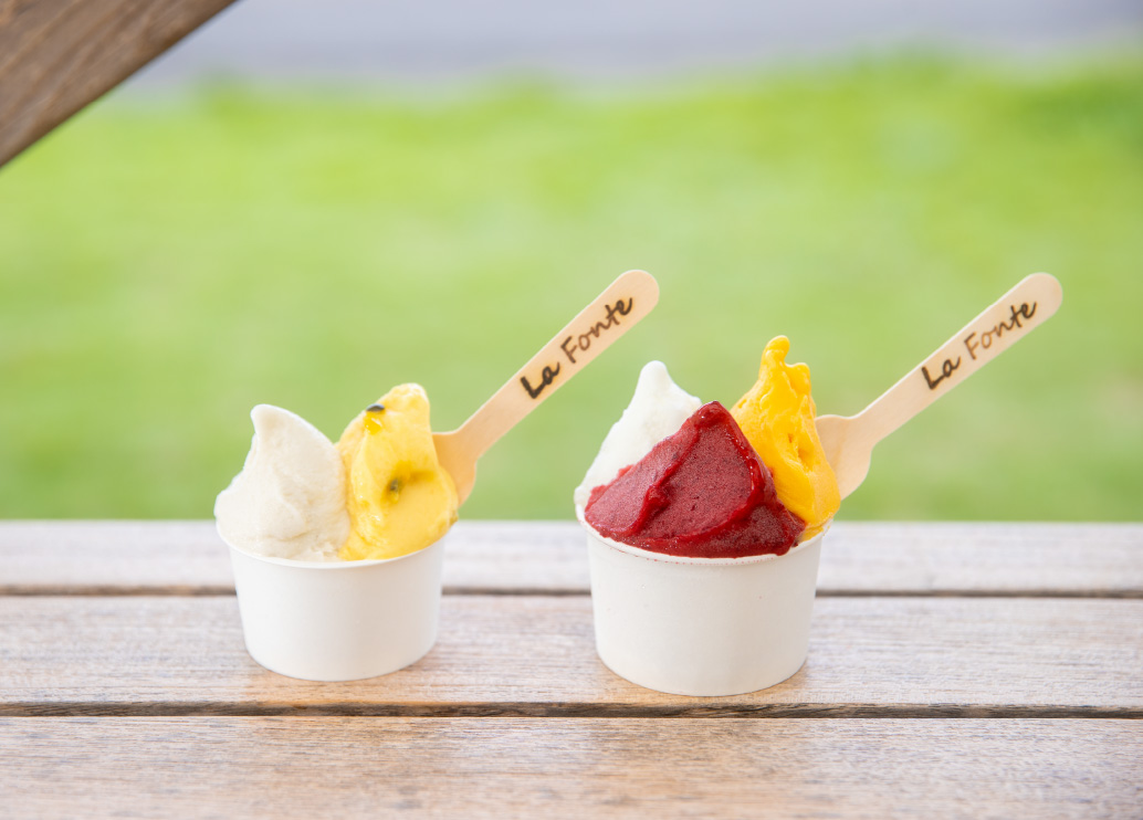自家農園で無農薬で育てたフルーツをふんだんに使用し、奄美産黒糖や島の海で採れた塩など地元の食材で丁寧に手作りしたジェラートが人気の「La Fonte(ラフォンテ)」。パッションフルーツや奄美黒糖、真塩など10種ほどが並び、ダブル500円、トリプル650円。