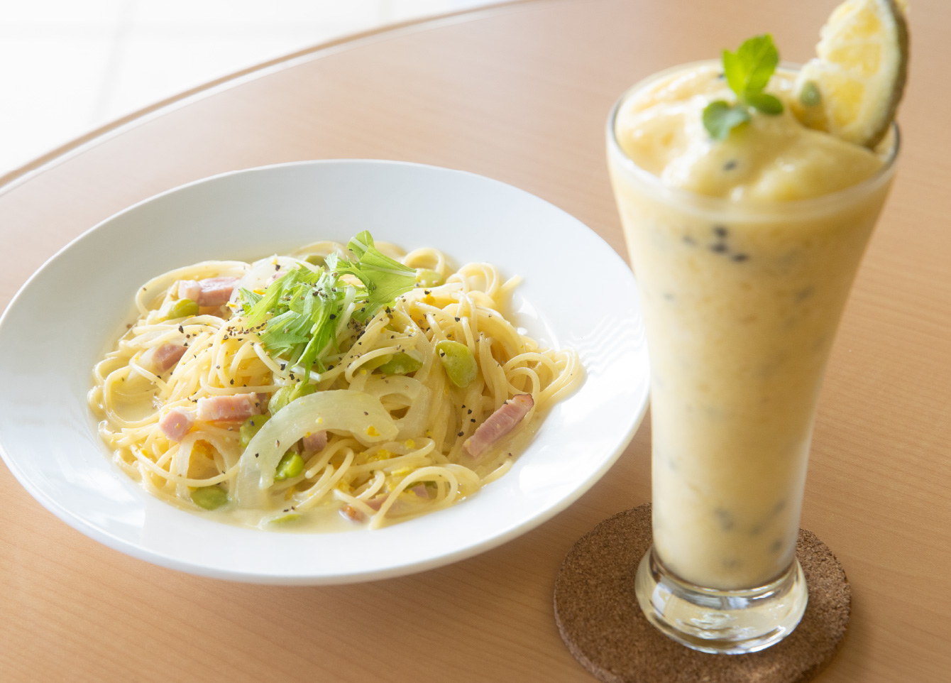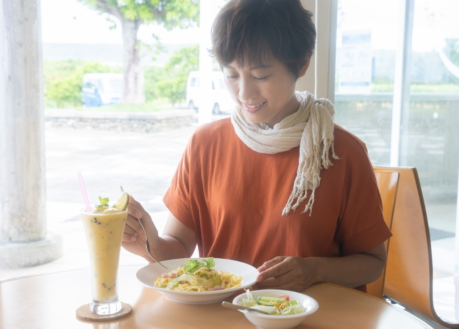 喜界島産の素材をふんだんに使用したメニューが人気の「yuraiba ゆいカフェ」。喜界島の在来島みかん「フスー」を使用した島みかんクリームパスタ(サラダ付)1,100円は、さっぱりとした酸味とクリームの相性が抜群。喜界島産の白胡麻を使用したロールケーキや喜界島産国産コーヒーを島で唯一提供。農産物加工センター内にあるので、 特産品や加工風景を楽しみながらゆっくりと過ごすことができる。