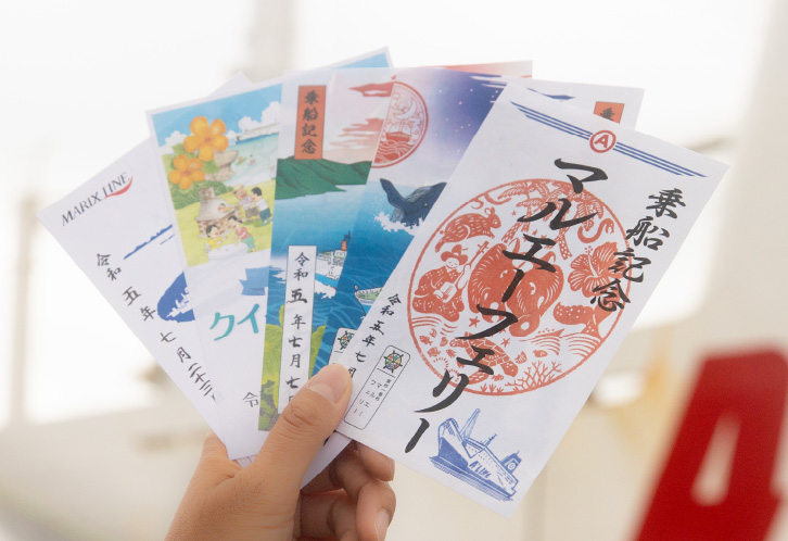 「御船印」とは、神社仏閣でもらえる御朱印の船バージョンのこと。北海道から沖縄まで全国各地の船会社が独自の印を発行しており、奄美群島を運航するマルエーフェリーとマリックスラインでも購入することができる。船によって異なる個性豊かなデザインが特徴で、船旅の思い出としてコレクションを楽しむ人も増えている。