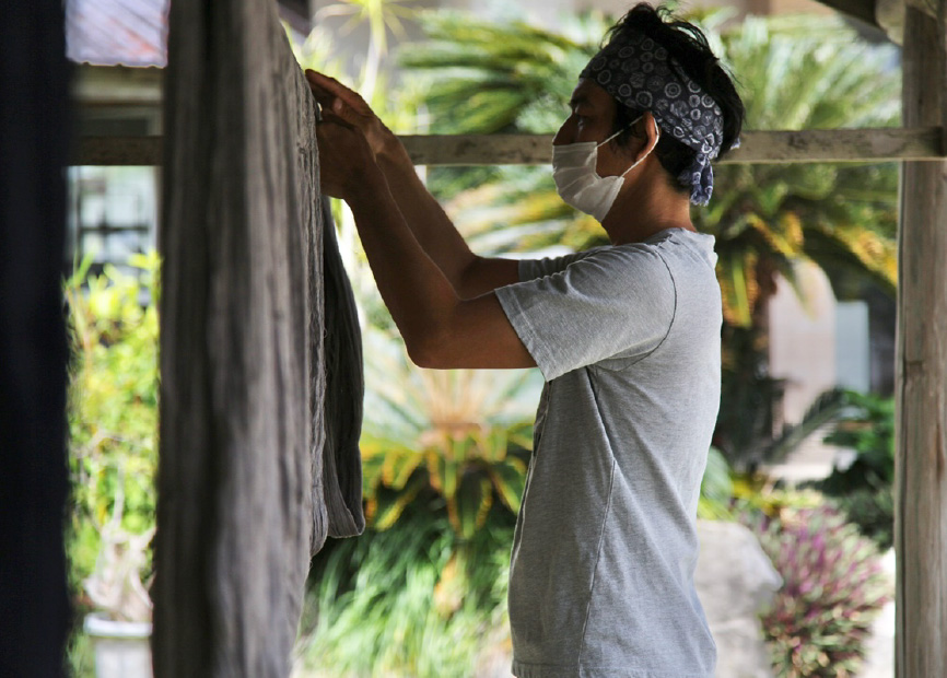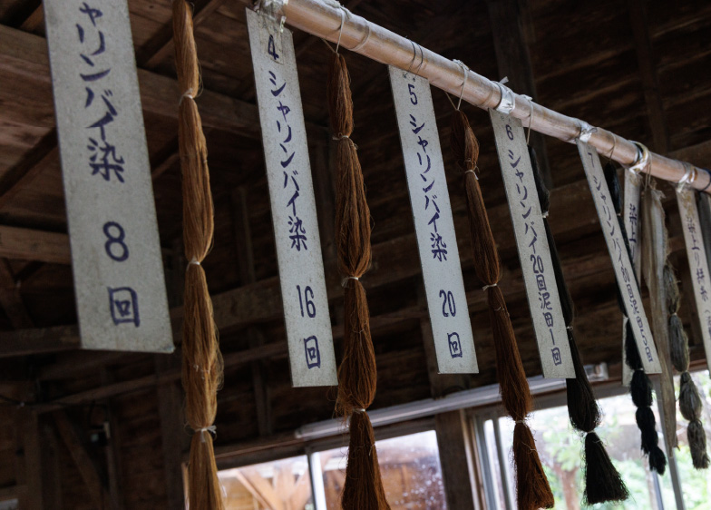大島紬を作る工程でカギとなる「泥染め」は、世界中で唯一、奄美大島だけでおこなわれている天然の染色方法。シャリンバイ(バラ科の植物)に含まれているタンニン酸色素と、泥土に含まれる鉄分が化学反応を起こし、ナチュラルで深みのある色に。なめらかな泥に浸してじっくり染めることで、繊維を傷つけることもない。奄美大島の大地が与えてくれる泥染めで、奥深い色へと丁寧に染め上げる。