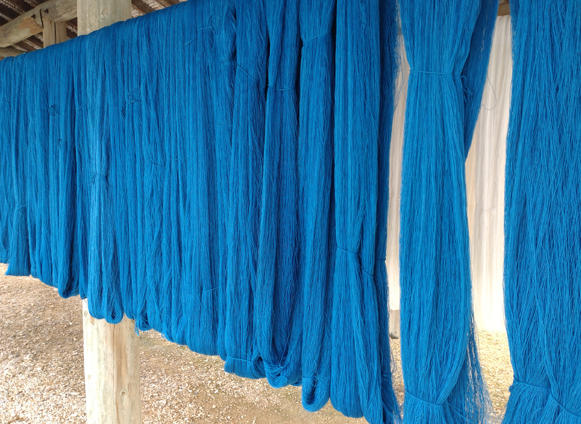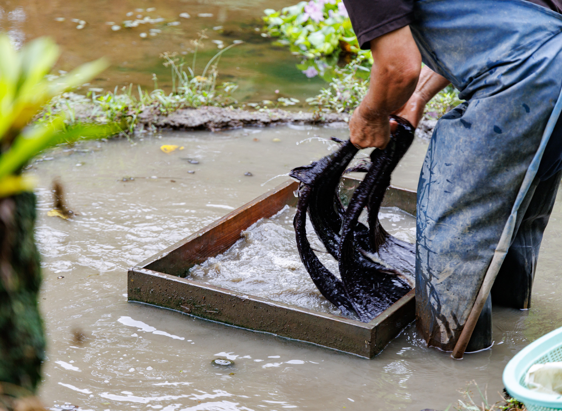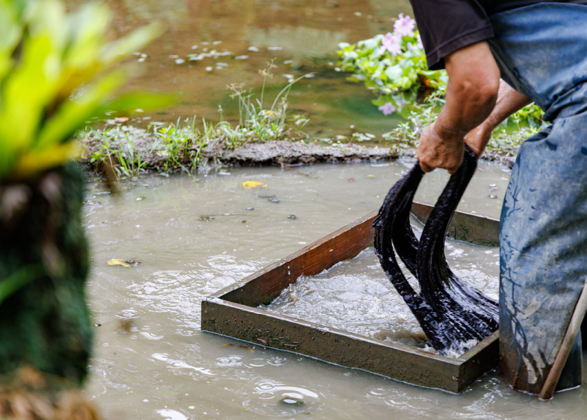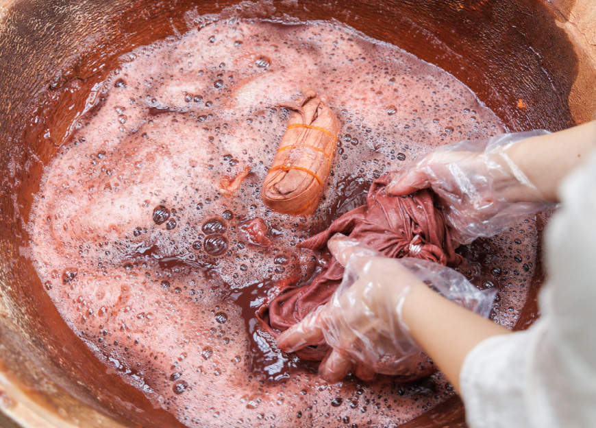 漬けたり揉んだりしながら、滑らかな泥でしっかり染めていきます。素足で入ると、自然の泥パックみたいで気持ちいい。