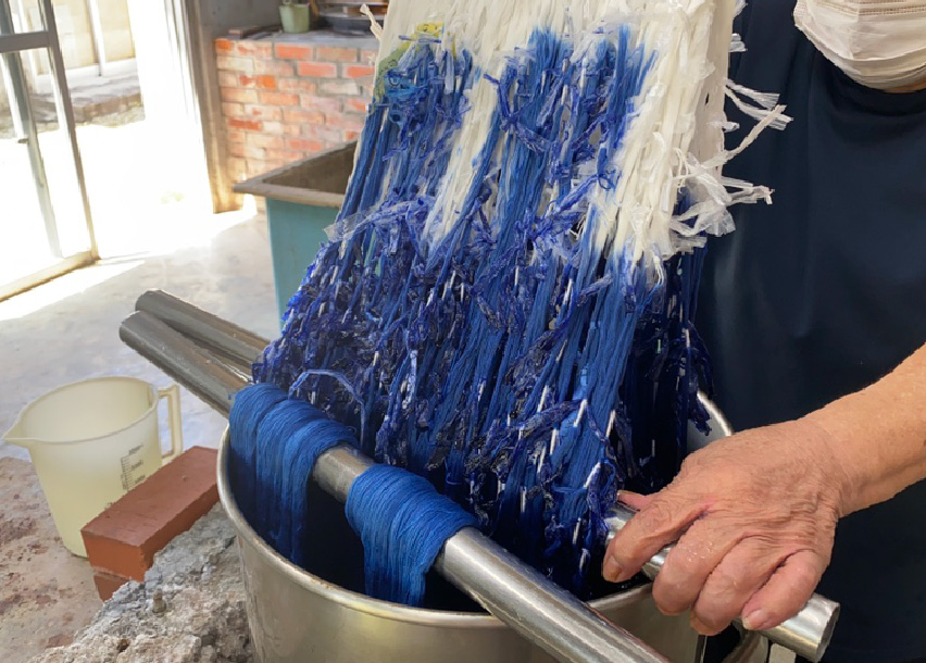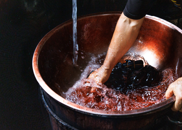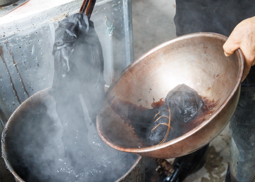 泥染めの後は水洗いで泥を落とし、生地を煮込みます。定着液に浸けて、乾燥させたら、絞りをほどいて完成です。