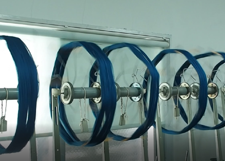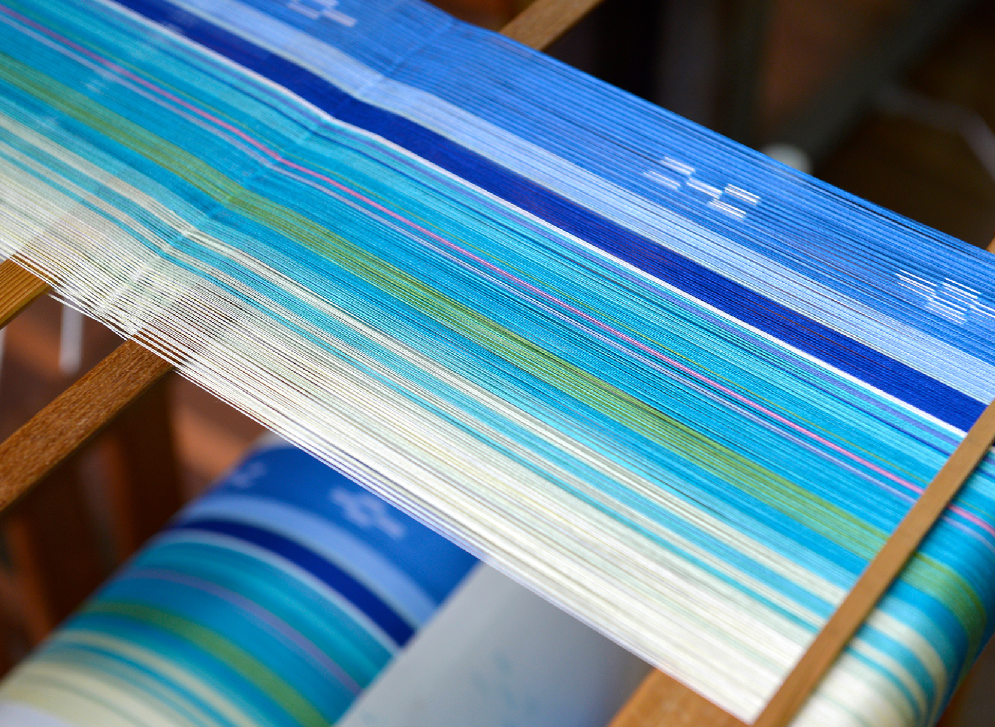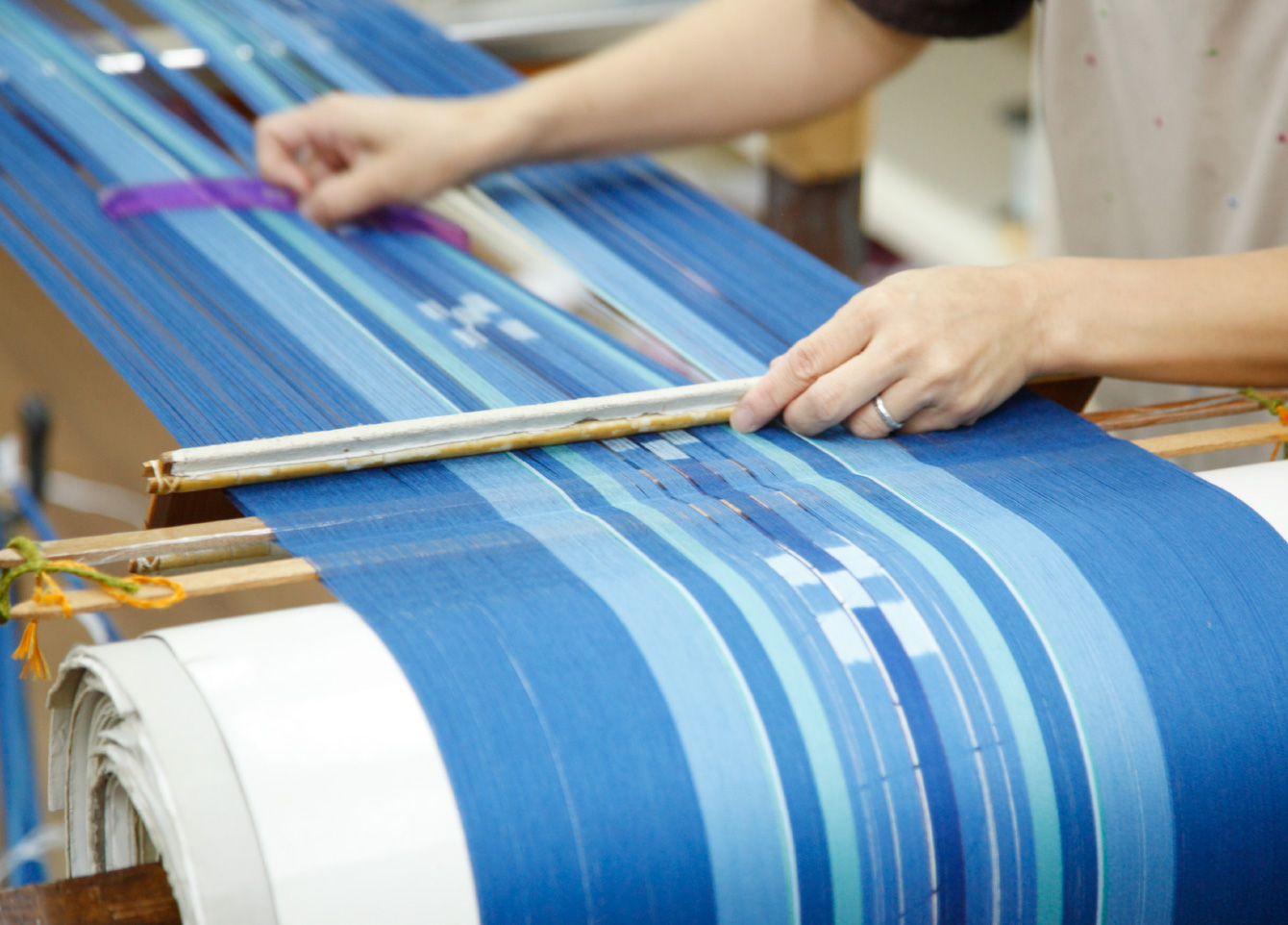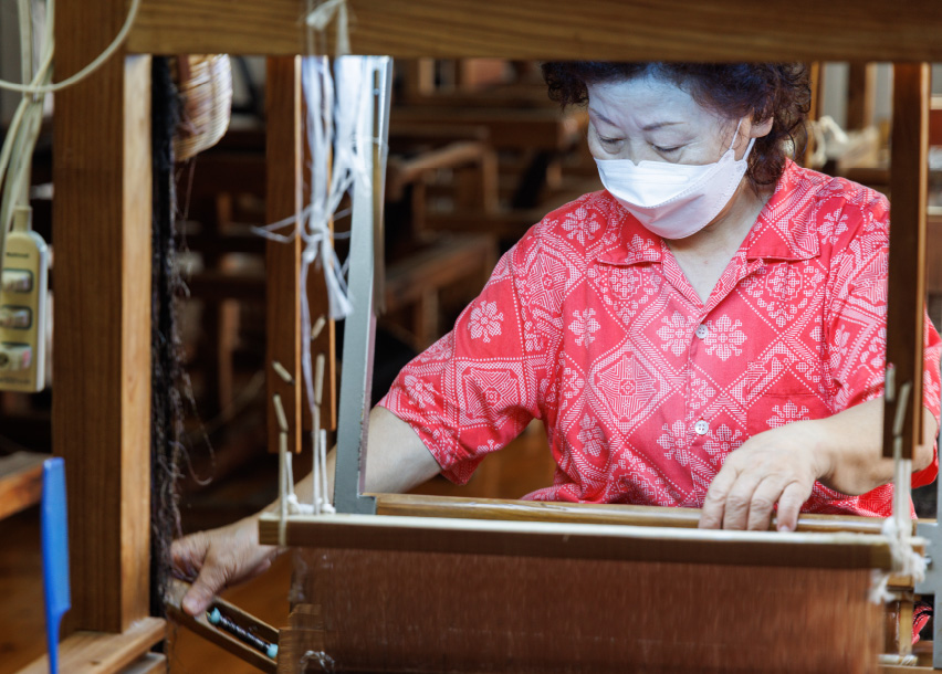 経糸と緯糸に木綿糸を使う八重山ミンサー。その工程は意匠設計、染色、絣括り、糊張り、巻取りなどの下準備作業を経て、綜絖通し、製織(織り)をして布が仕上がる。一つひとつ丁寧に手作業で作られており、職人たちの技術と想いから八重山ミンサー織が形となっていく。
