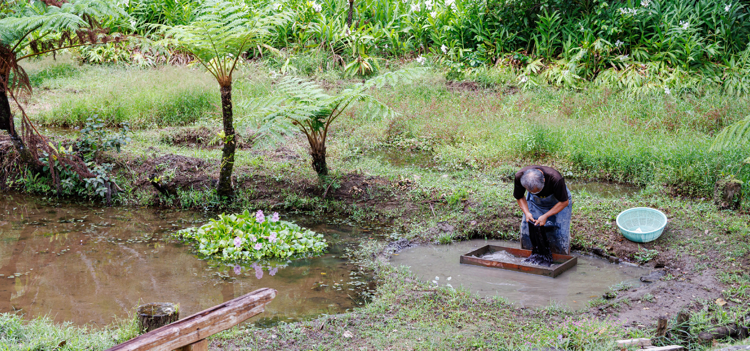 奄美大島にある本場奄美大島紬の織元が運営する「大島紬村」で、実際に大島紬を染める泥田での泥染めを体験してきました。大島紬、泥染めに携わって40年以上の泥染め職人に教わりながら、Tシャツ・ハンカチ・エコバックを染めていきます。