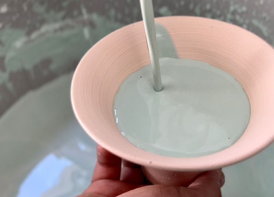 シャリンバイの木から抽出した染め液と石灰水につける作業を3回繰り返します。泥染め前の大事な工程です。