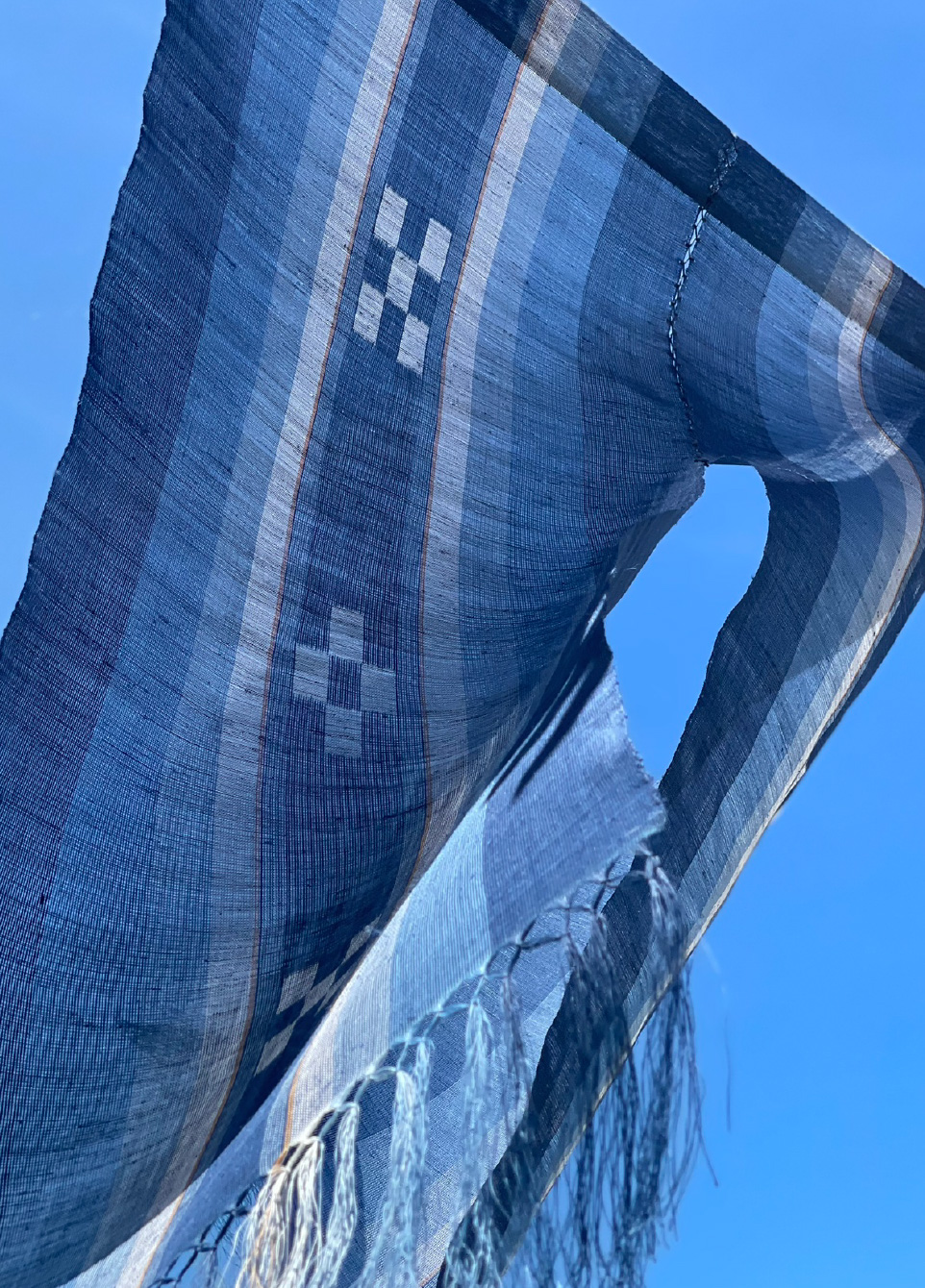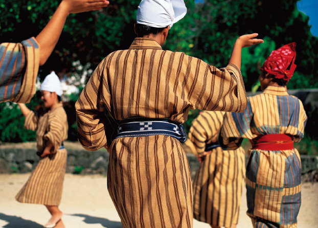 五つの絣柄と四つの絣柄を特徴とし、綿糸を藍で染めて織った細帯。八重山ミンサー織の最大の特徴である五つと四つの絣模様には「いつの世までも末永く幸せに…」という意味合いが込められている。