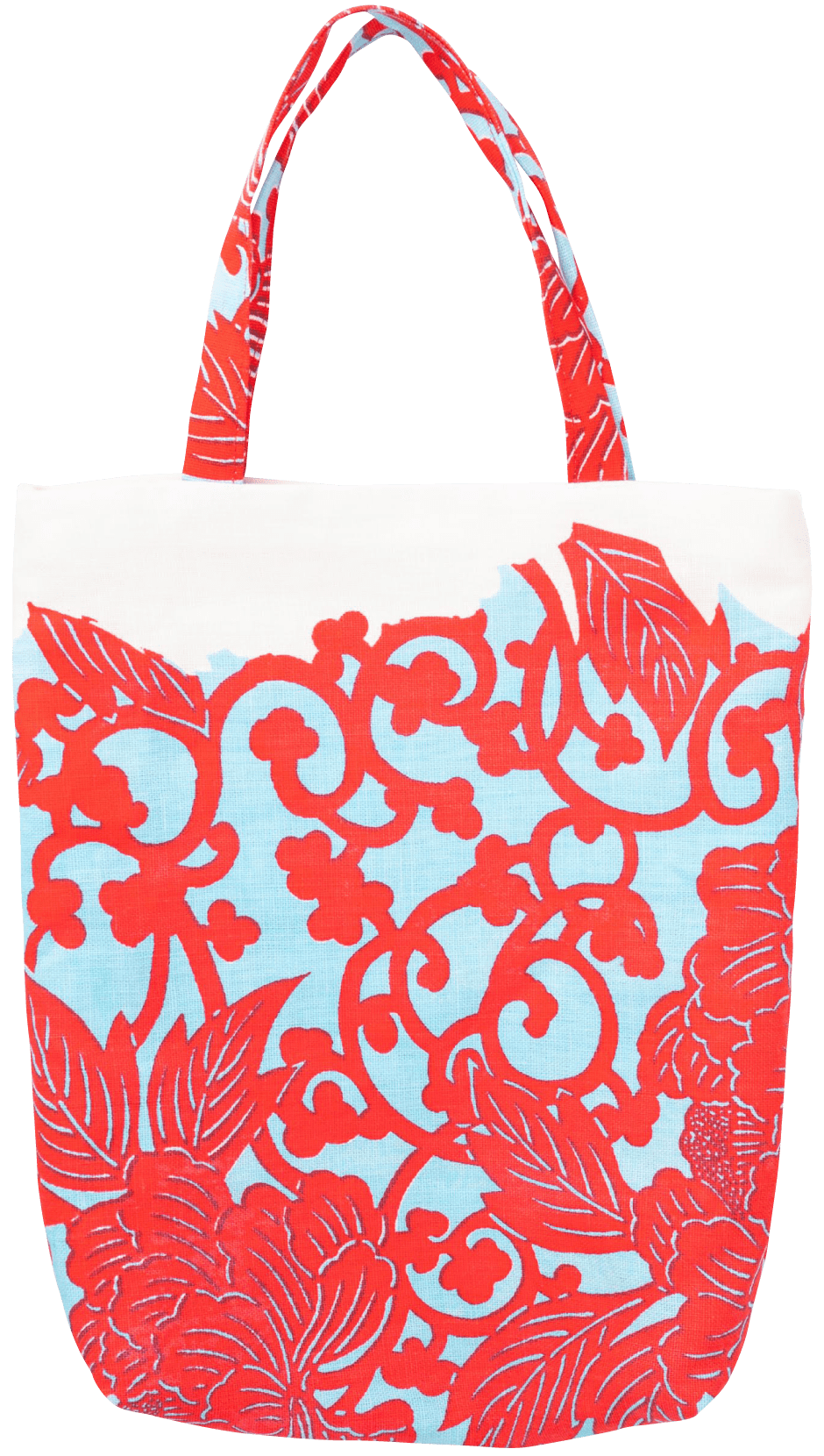 更紗として古くから伝わる唐草牡丹の柄を用いたミニサイズの縦型トートバッグ。生地は、耐久性のある上質なリネンを使用。唐草牡丹柄は更紗として古くから伝わるもので、唐草は「長寿・繁栄」、牡丹は「幸福・高貴」や「不老長寿」という意味を持つ。
