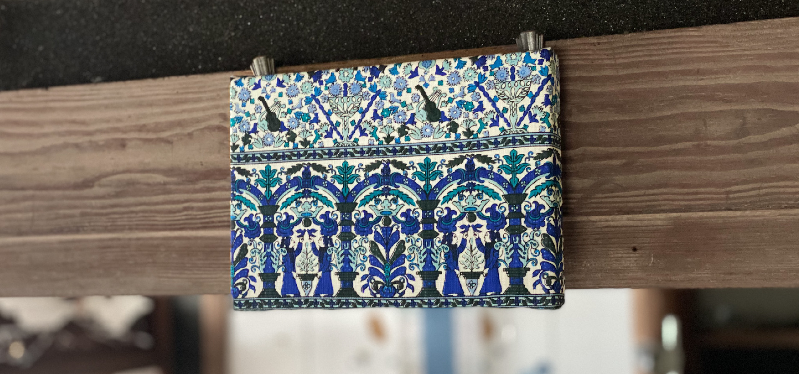 更紗として古くから伝わる唐草牡丹の柄を用いたクラッチバッグ。コンパクトな見た目で、長財布・スマートフォン・小さなポーチがしっかりと収まる容量。手染めした生地のため、風合いが微妙に異なり1つとして同じ商品は生まれない。