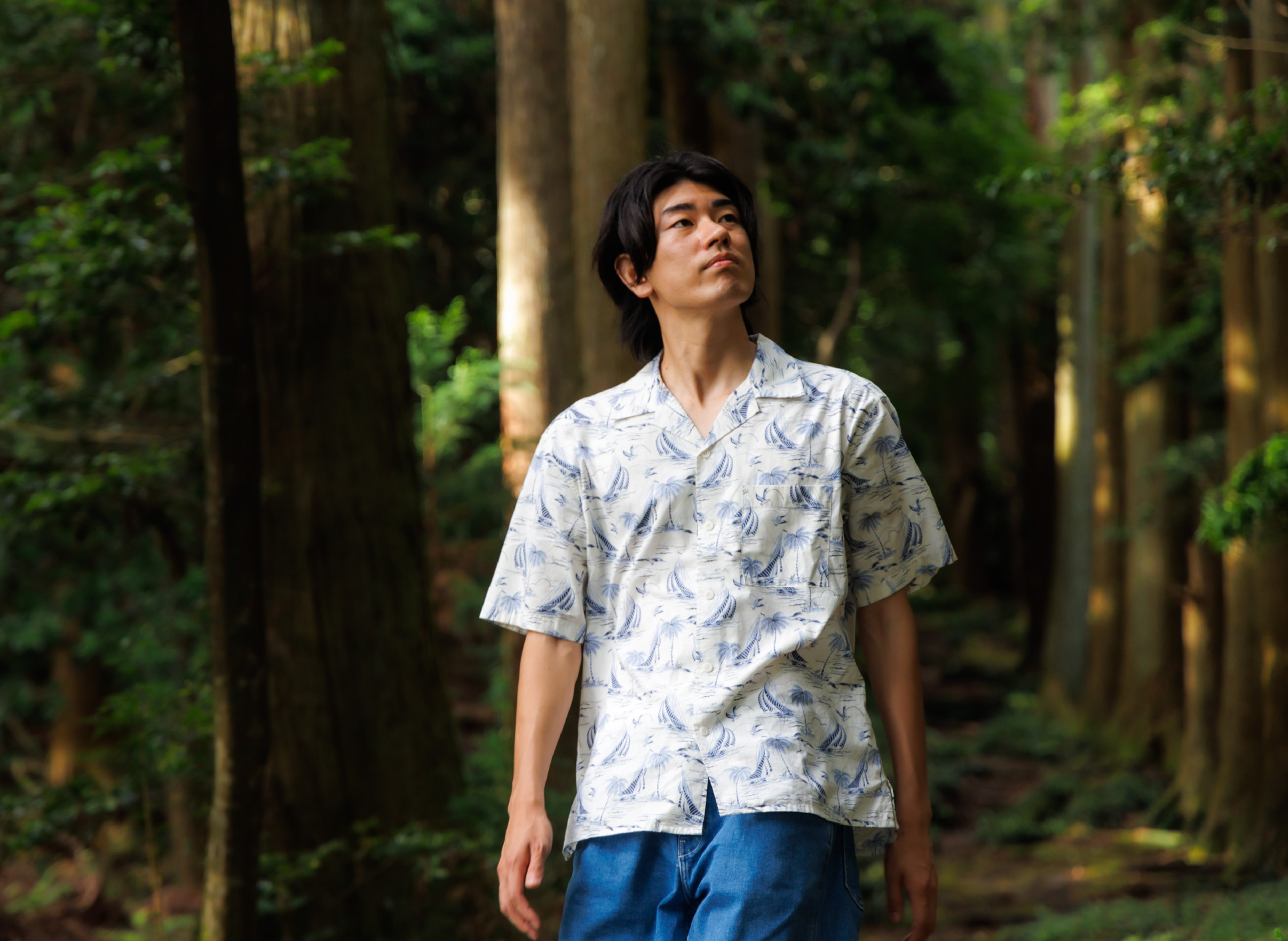 泉津の集落から南に位置する波治加麻神社は、神秘的な杉林が美しく、苔の絨毯が広がる癒やしスポット。周辺には、2本の椎の巨木が大地を切り開いているかのように見える泉津の切通しがあり、階段を通って森へと続いていく景観はフォトスポットとしても人気。