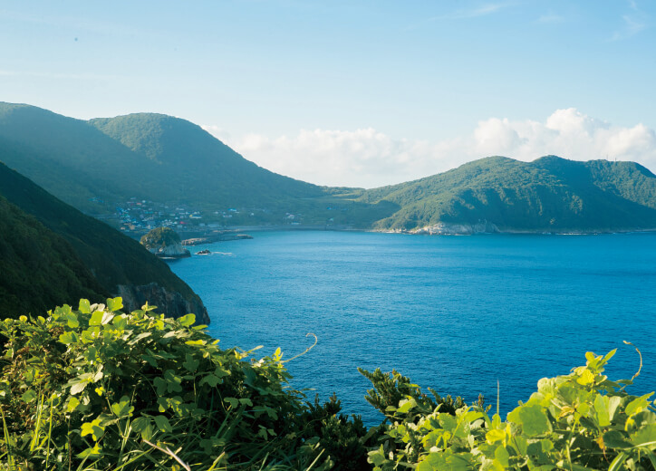 高知県の南西部、宿毛湾の南西沖に位置する沖の島は、四国と九州の間に浮かぶ、都市部からのアクセスが最も不便な離島。足摺宇和海国立公園に指定される透明度の高い海はもちろん、石垣・石段がおりなす美しい景観はこの島ならでは。島民との温かい交流にも癒される、これぞスローライフを満喫してください。