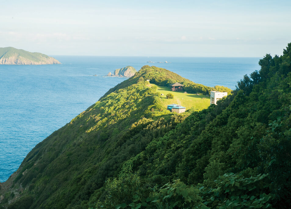 母島集落と弘瀬集落の中間あたりにある白岩岬キャンプ場。道路から見ると海に浮かんでいるように見える美しいキャンプ場は島の人気スポット。秋には、渡り蝶としても有名なアサギマダラも島を訪れます。