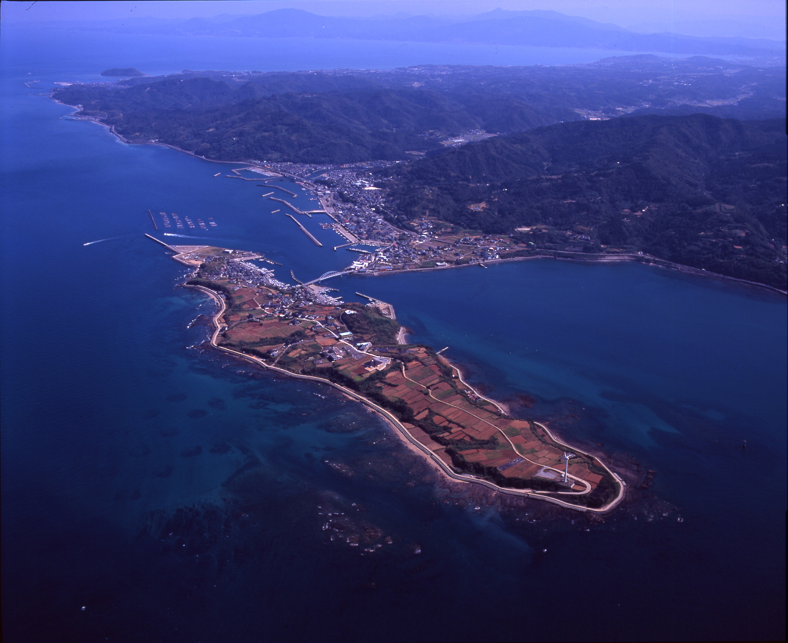 天草下島の北端に浮かぶ通詞島。熊本県天草市五和町二江(ふたえ)地区にあり、島の外周は4 kmほどの、車であれば10分ほどで1周できる島です。1975年に通詞大橋が開通するまでは、手漕ぎの渡し舟が行き来するようなのどかな風景が広がっていました。しかし、橋の開通後は車での往来も増え、訪れる観光客も増加。五和町の二江港から漁船にのって5~15分の沖合には、野生のミナミハンドウイルカが300頭ほど生息しており、「イルカと会える島」としても知られています。イルカウォッチングを目的とする観光客も来島するようになりました。海からの恵みを大切にする島民にとって、イルカの存在は大きく、観光資源としてだけでなく大切な島のシンボルです。島の東西の端に見える白い風車は通詞島風力発電所。イルカが棲む豊かな自然を生かし、守るためのクリーンエネルギーを創出しています。宿泊施設は旅館や民宿が中心。島内には路線バスが走っていますが、本数はそう多くはありません。レンタサイクルの貸し出しも可能です。イルカが泳ぐ島として国土交通省「島の宝100景」に、また五和町二江地区が「にほんの里100選」などに選出されました。