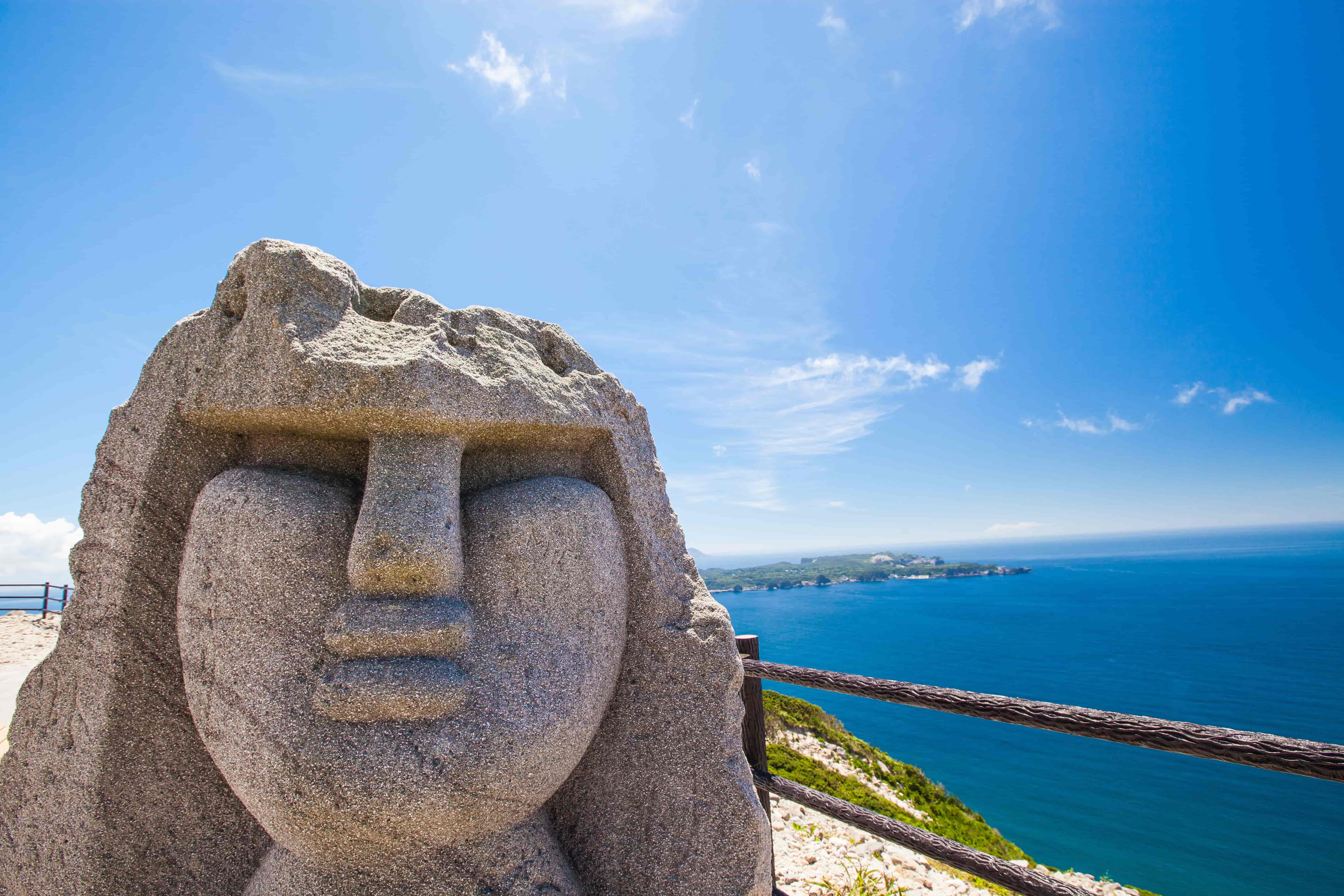 島の形は、約3000年前の宮塚山の北側に位置する新島山と、新島で唯一黒い玄武岩質の若郷火山の噴火、そして886年(仁和2年)の新島南部の海底噴火によって向山と新島中央の平野部が形成され現在の形になりました。東京諸島の中では、これだけの平野部に恵まれた島はほかにありません。気候は東京よりやや温暖で、真夏でも都内の猛暑よりは過ごしやすさがあります。ただ、冬は西高東低の冬型の気圧配置になり、等圧線が混んでくると晴れていても15m以上の西風が吹き荒れることも珍しくありません。この季節風を新島では「西ん風」と呼んでいます。東京から約160kmの距離ですが、エメラルドグリーンの海は美しく、空気はとても澄んでおり、夜は満天の星空の中にミルキーウェイを見ることもできます。島内のいたるところにコーガ石で掘られたモヤイ像があり、渋谷の駅前にあるモヤイ像は新島から贈られたものです。コーガ石は、抗火石ともいう軽石の一種。世界ではイタリアのリパリ島と新島でのみ採掘される、世界的にも珍しい石です。このコーガ石を原料としたガラスは、独特のオリーブ色を帯びるのが特徴で「新島ガラス」として特産品になっています。産業は、水産加工品の代表的存在で特産品でもある「くさや」を代表とした漁業、新島の料理に欠かせない「明日葉」をはじめとした農業、若者や家族連れの海水浴客、サーファーなどが訪れる観光業が盛んです。