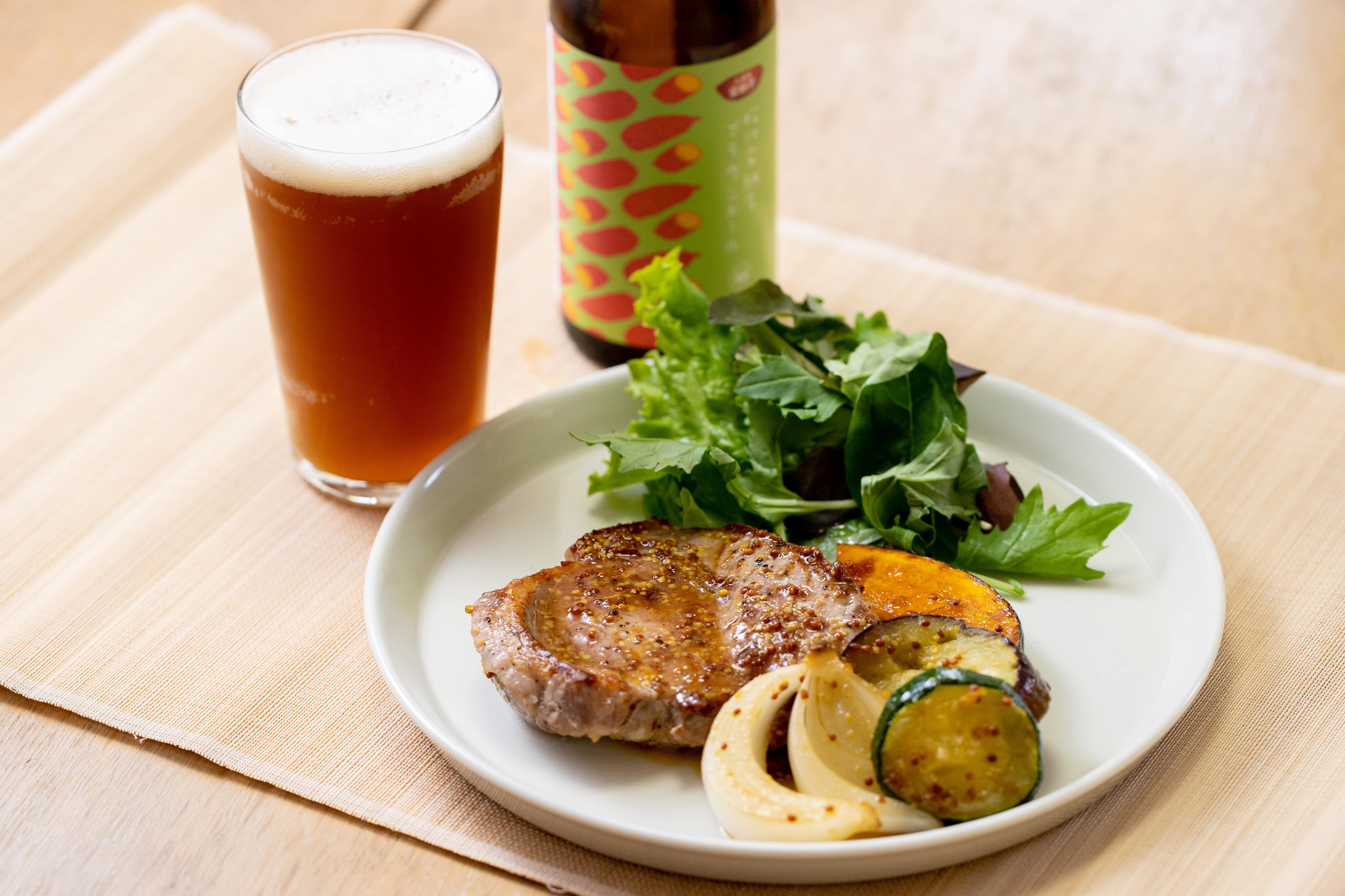 マスタードソースでいつものポークスステーキが、満足感のあるごちそう料理に早変わり。やさしいお芋の香りが広がる「大根島産 松江安納芋ブラウンエール」と合わせて、家飲みも楽しもう。