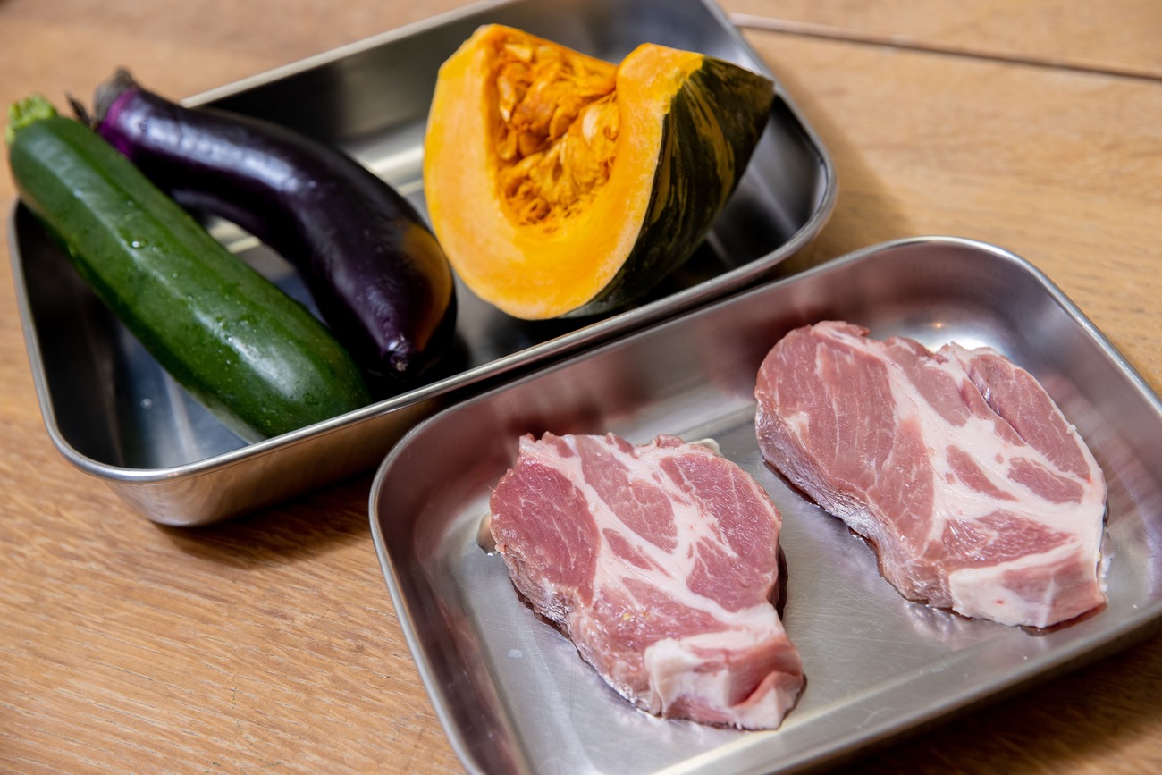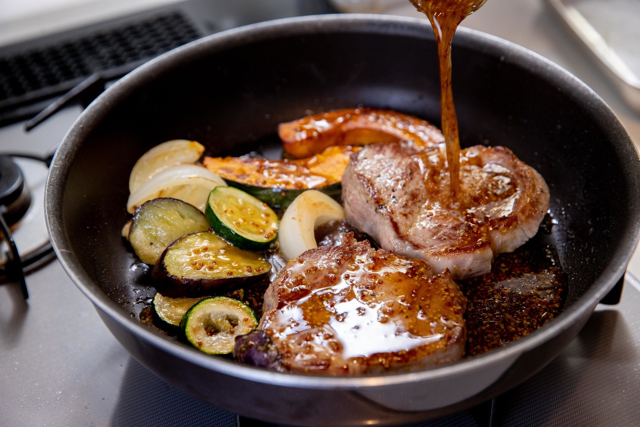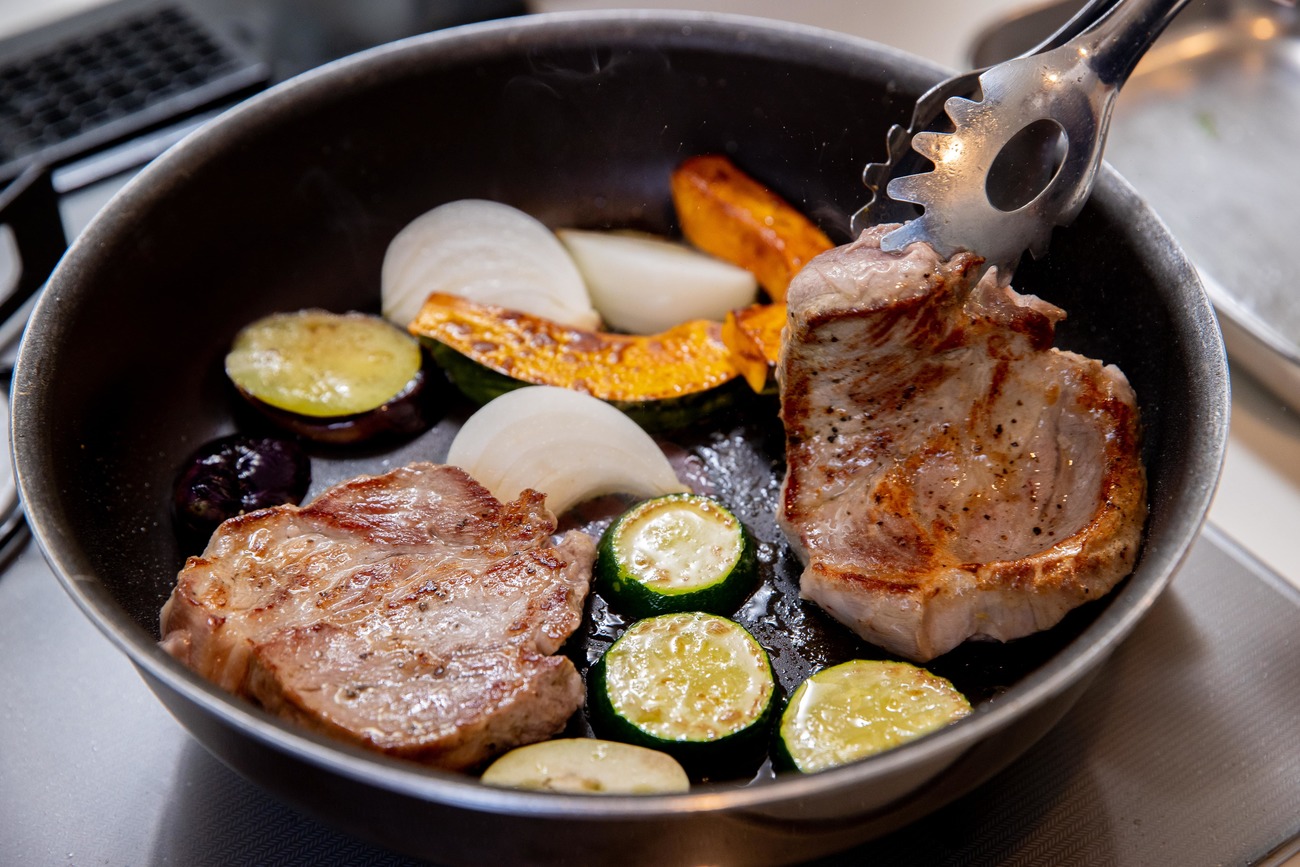こんがりと色づいたら豚肉と野菜の上下を返し、裏側にも火を通します。かぼちゃは竹串でさして、すっと通るようになるまで熱しましょう。