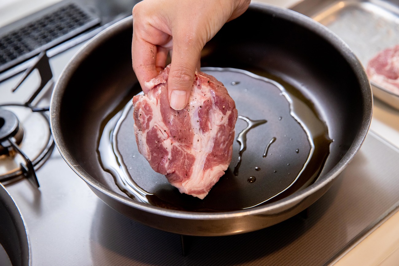 まず、豚肉の脂身に切り込みを入れて筋切りします。そのまま室温で15分ほど置き、両面に塩こしょうをふります。室温に戻すことで焼きムラが出にくく、火が通りやすくなります。