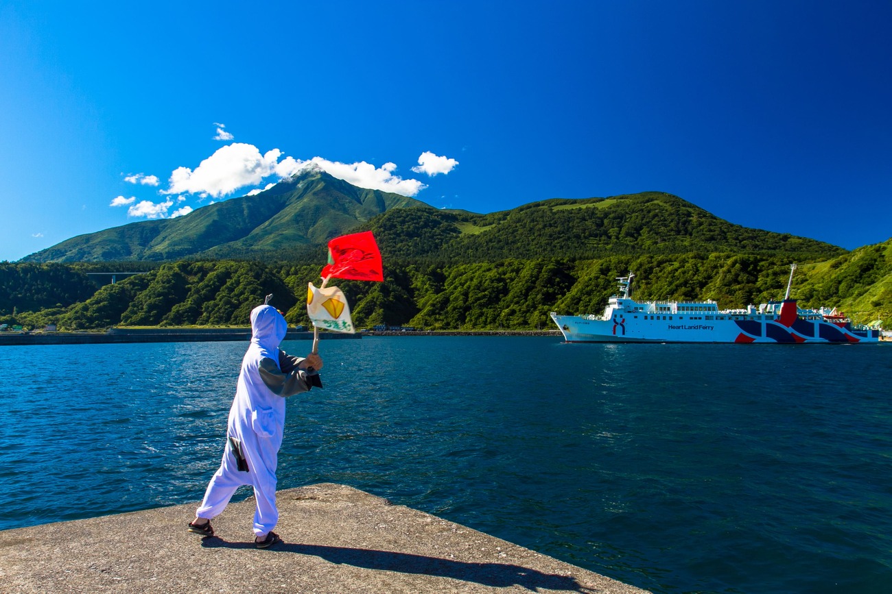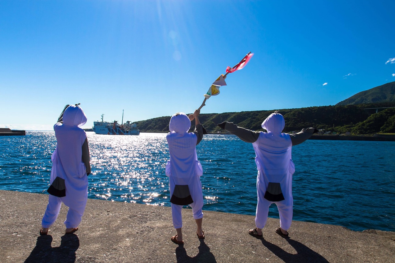 翌朝、「いづやんも来る?」と誘われたのは、同宿の旅人が島を抜ける見送りでした。島旅では見送りが特別なイベントになることが多く、利尻島も例外ではありません。フェリーターミナルの対岸で待機し、船が出港したら旗を振って見送るそう。利尻うみねこゲストハウスでは、さらにウミネコの着ぐるみを着る念の入れよう。「いづやんの分もあるから」と西島さんに渡され、僕もしっかり着込んで見送りしました。