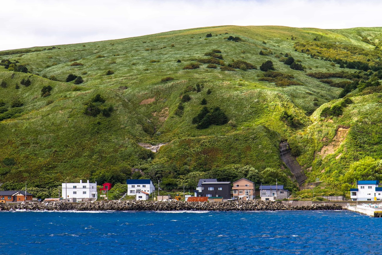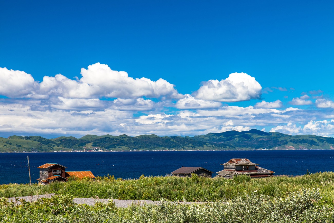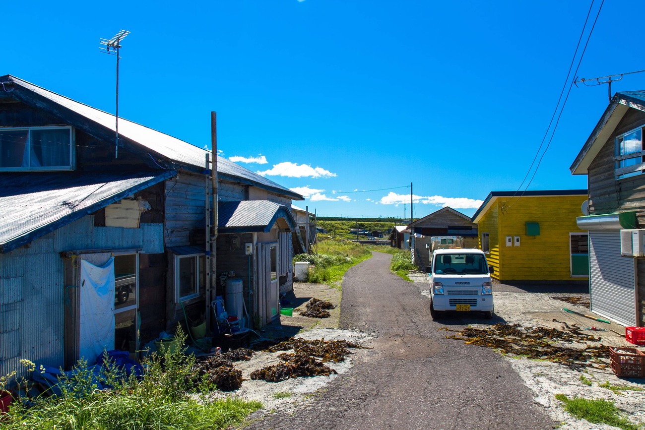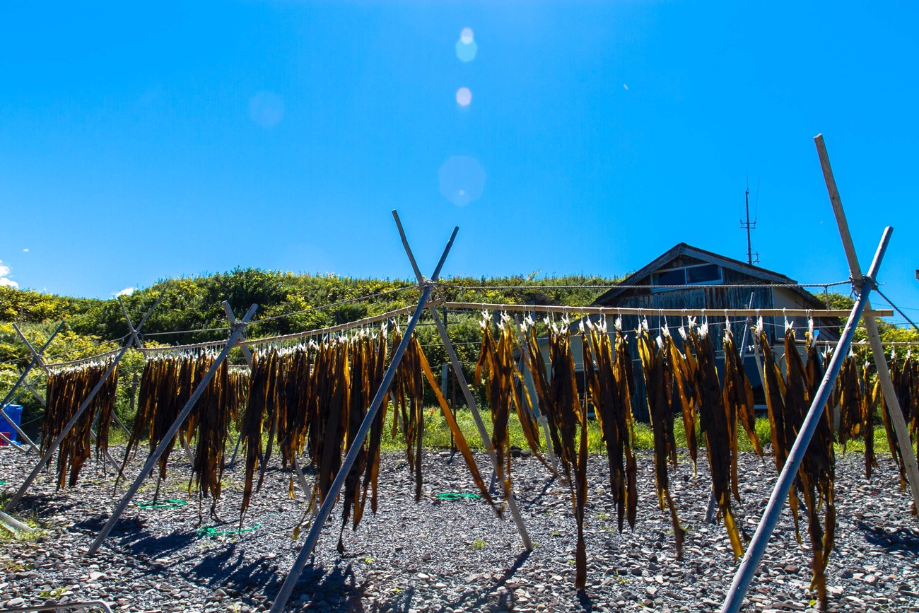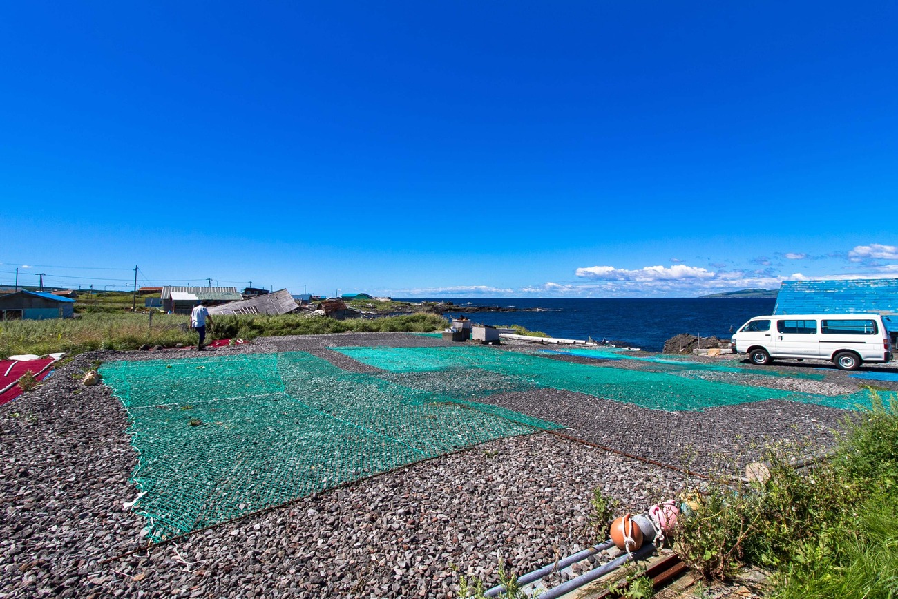 見送った後は、島を反時計回りに一周することにしました。北部にある富士野園地には見晴台があり、青い海に浮かぶポンモシリ島が見えます。島一周道路を走っていても、良さげな脇道があるとつい入ってしまいます。吉永小百合主演の映画「北のカナリアたち」のロケ地だった集落や、点在する利尻昆布を干す光景が海沿いに続きます。小さな入江では小舟でウニを採っているところや、地面に網を広げている漁師さんの姿も。「これは昆布を干す網だよ。そろそろ昆布漁の季節も終わり。秋になると昆布が枯れてくるからね」とのこと。