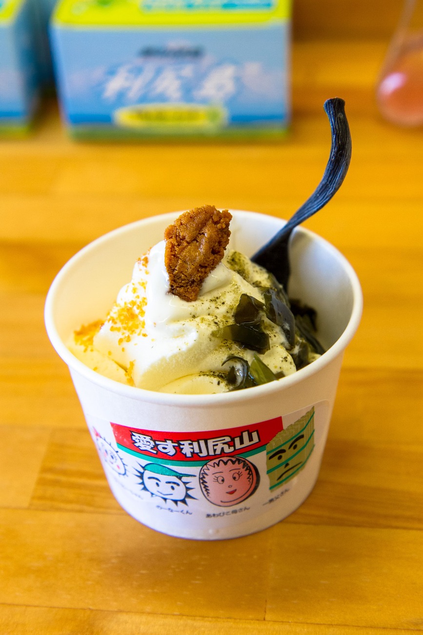 デザートには、同じ沓形の町にある「北利ん道(きたりんどう)」さんで、利尻島のウニと昆布を使った不思議なアイス「愛す利尻山」をいただきました。ソフトクリームに乾燥ウニと細かく刻んだ昆布を載せ、さらに乾燥ウニの粉末と昆布塩が降りかかっています。これがなかなかどうして美味しいのです。