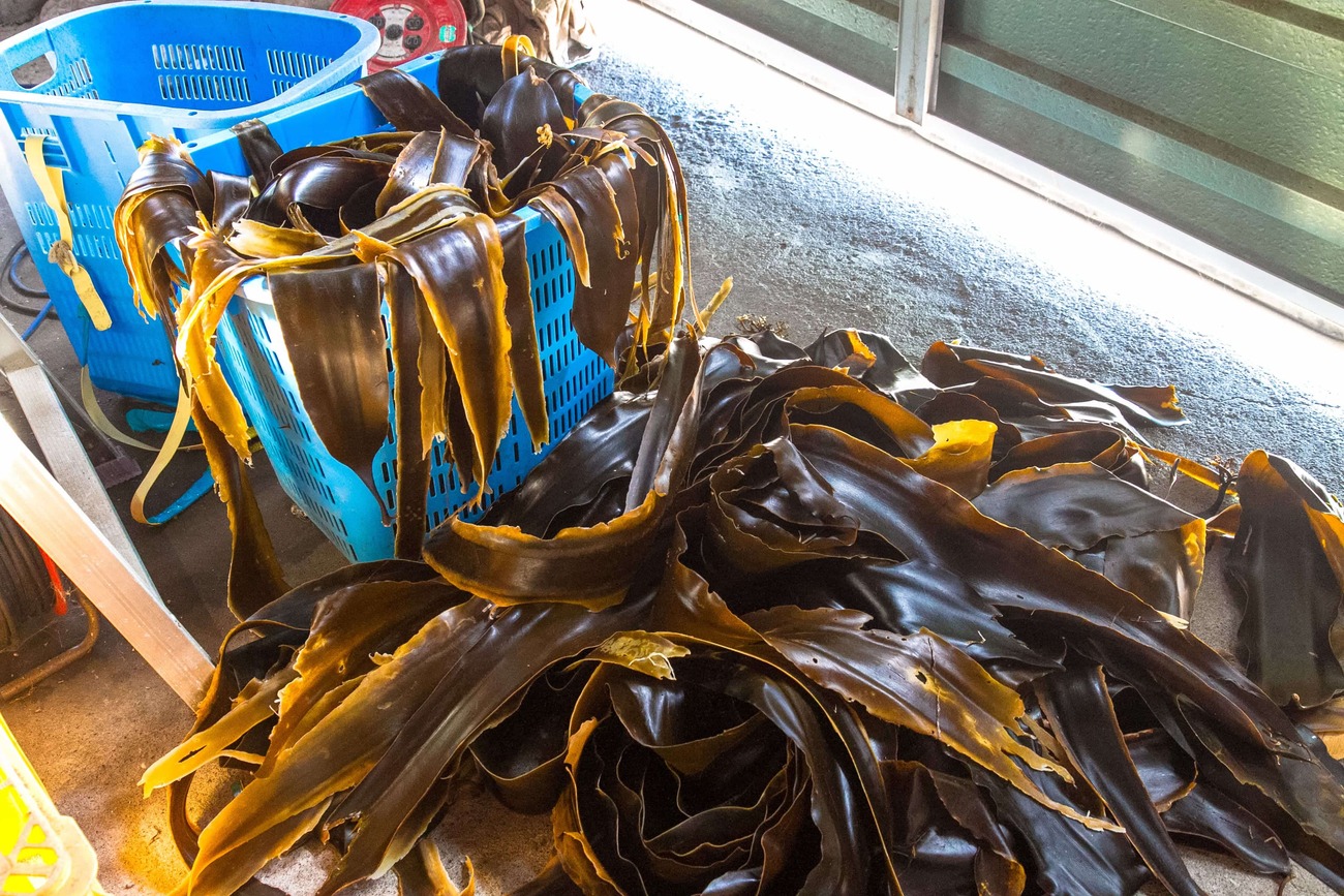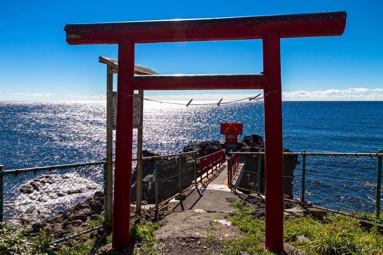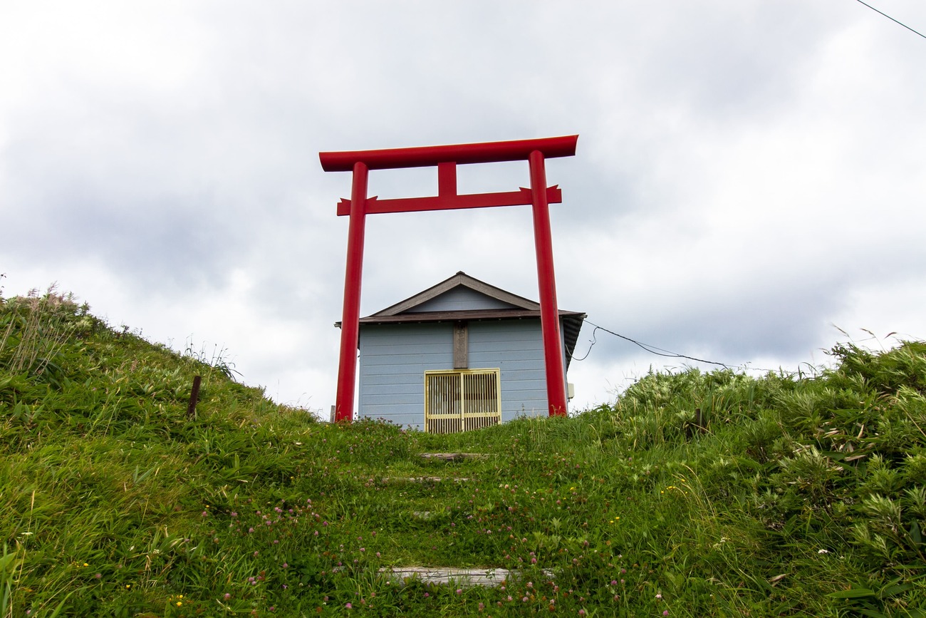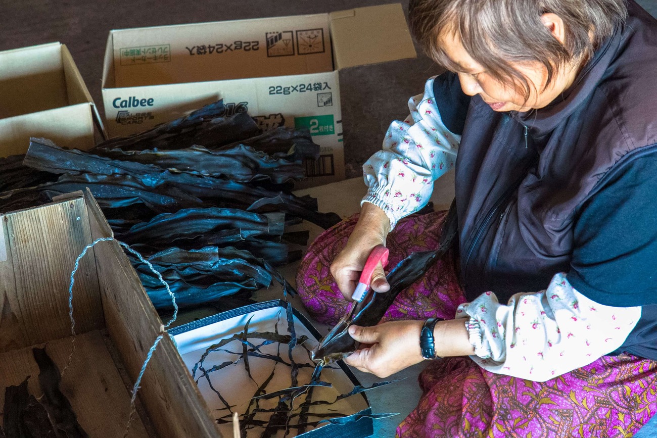 沓形を後にしてさらに南へ。道沿い、海を背にして立つ赤い鳥居や工場内で昆布の長さを整えているおばあさんなど、島ならではの風景が旅情を掻き立てます。
