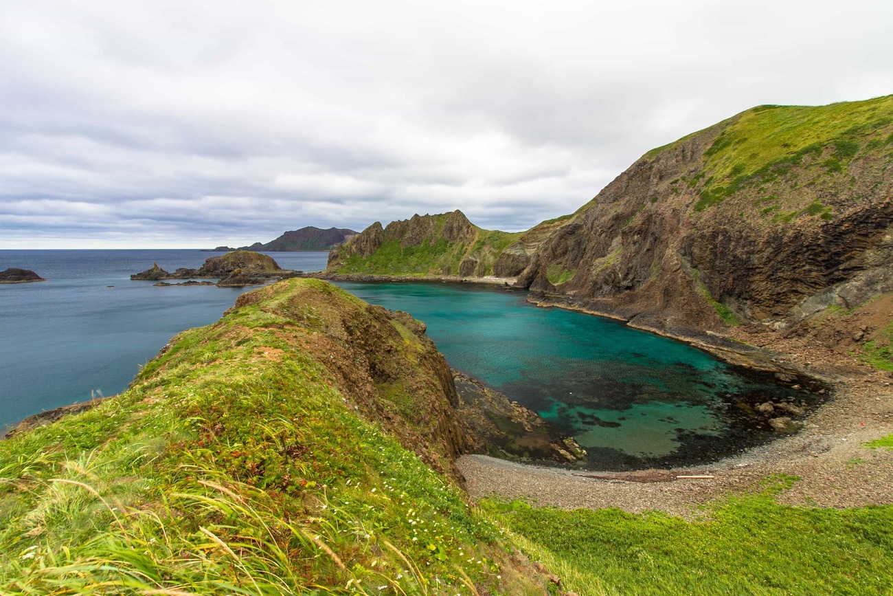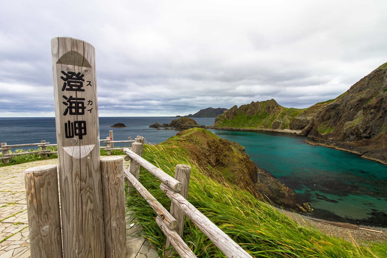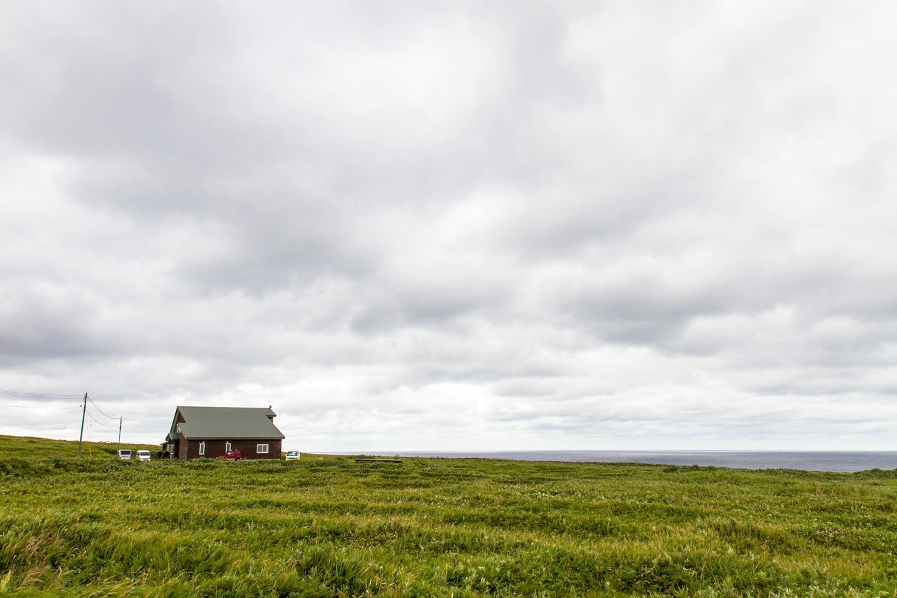 「明日はやっぱり午後から船が欠航になりそうだねえ」と常連さん方が言っていたので、半日で行けるところは行っておこう、とスクーターを走らせます。まずは、日本の有人離島で一般人が行ける最北端、スコトン岬へ。空は鈍色、岬には誰もいない。風も強く、8月なのに寒さが沁みてくるので、地の果てに立っている気がしてきます。岬のすぐ先に見えるのは「海驢島(とどしま)」という無人島。明治期までトドの群生地だったので付いた名だとか。現在はゴマフアザラシが回遊してくることが多いとか。