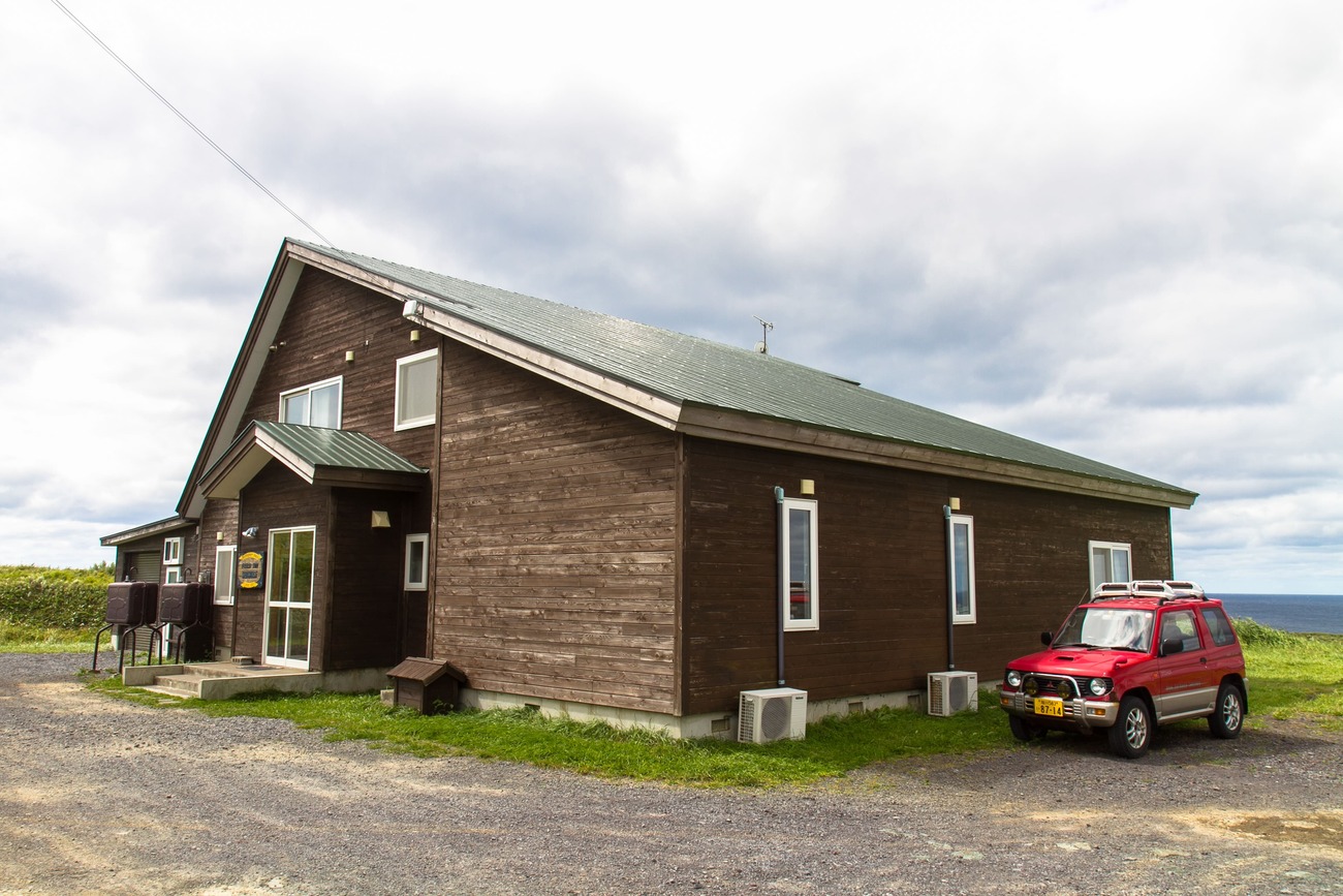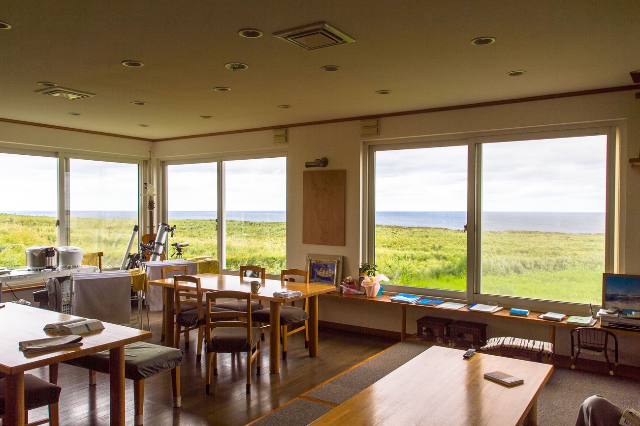 香深港から北を目指すこと1時間ほど。礼文島最北端のスコトン岬手前にある「FIELD INN 星観荘」さんがこの日の宿です。日本海を望む草原に、ぽつんと佇むロッジ風の宿。重く広がる雲も相まって最果て感が凄まじい。それとは裏腹に、オーナーの彦さんや、常連のお客さんはみなフレンドリーで、初めてなのに親戚の家に来たような安心感がありました。なにより、食堂兼ミーティングルーム「ブラックホール」は、大きな窓から草原、その向こうに日本海の水平線が広がっていました。この景色を日がな一日眺めていたい、そんな絶景でした。ここもユースホステルや民宿が合わさったような宿で、僕が島旅にハマるきっかけになった小笠原は父島のユースホステルに雰囲気がよく似ています。