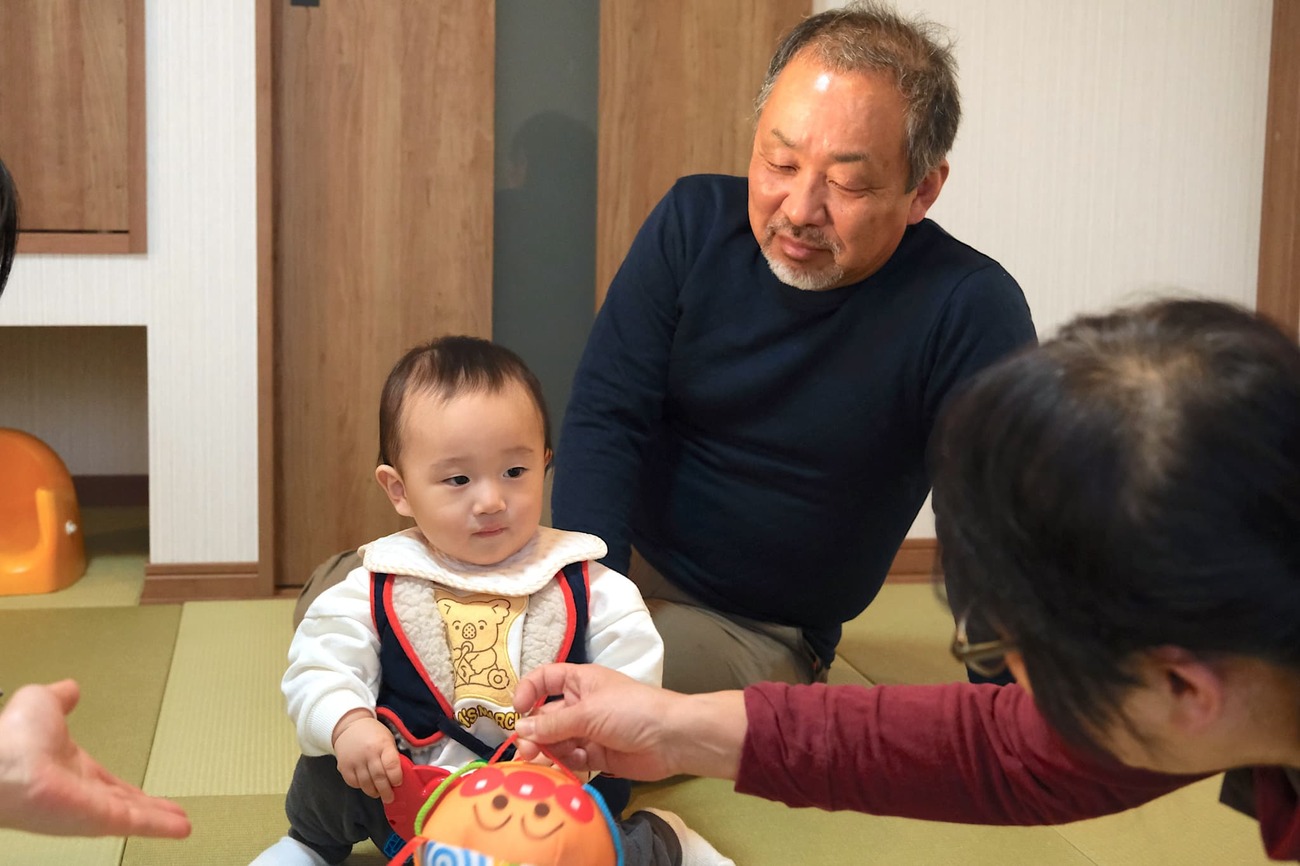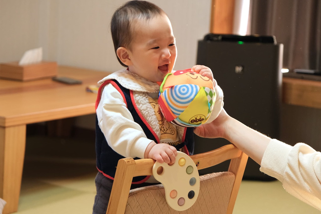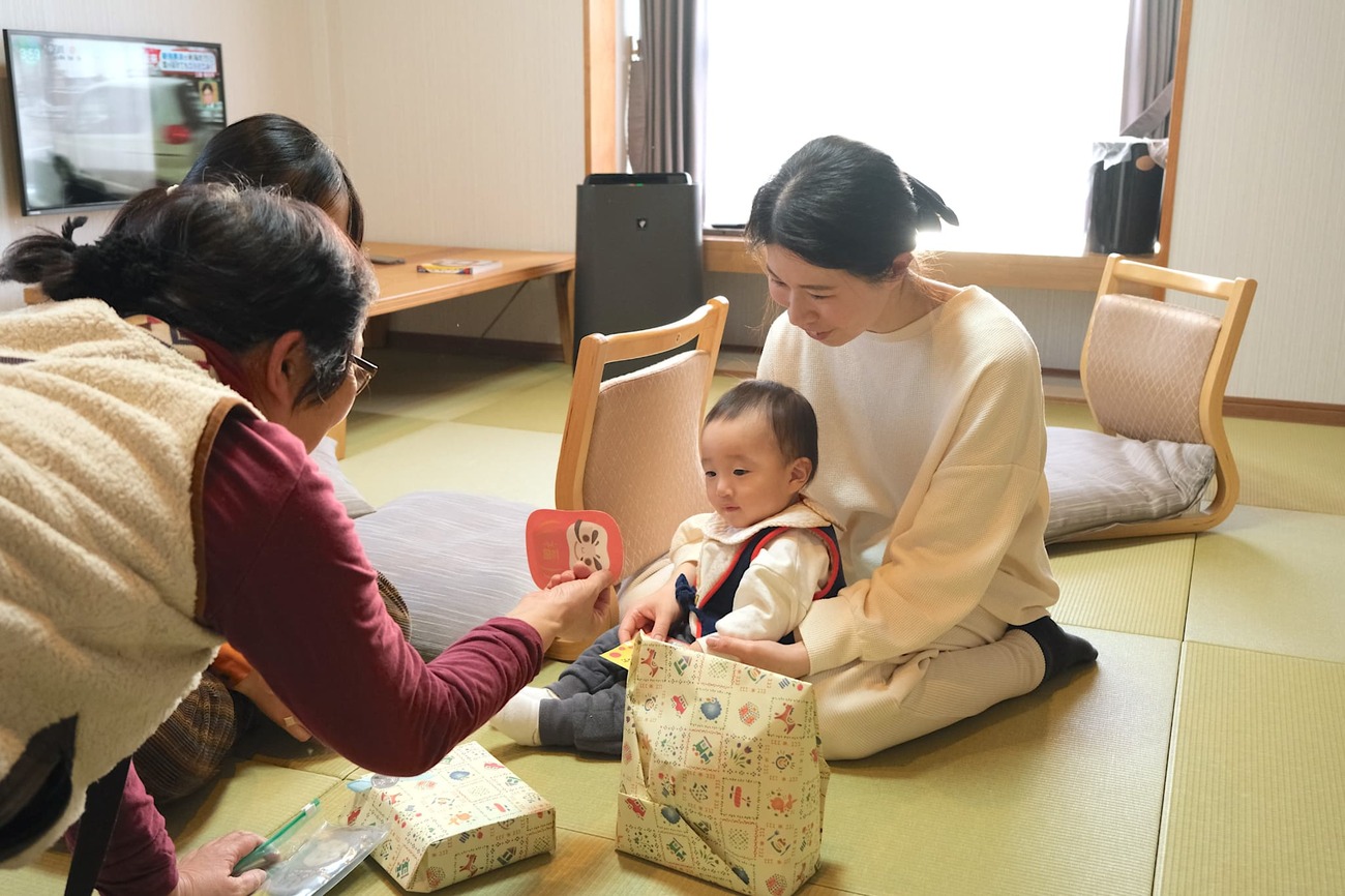 ミルクや離乳食の準備もあるため、私たちは15時より少し早めにチェックインし、まずは部屋でゆったりと過ごしました。しばらくすると、16時過ぎに私の父・母・妹も到着し、これで3世代が勢ぞろい。広々とした和室を予約することで、みんなが自然と集まりやすく、家族団らんのひとときを過ごせます。さらに、この日は我が子の1歳の誕生日。祖父母や叔母からたくさんのプレゼントをもらい、部屋の中をハイハイしながら嬉しそうに遊ぶ姿が微笑ましく、祖父母にもすっかり懐いていました。旅先で家族の時間をゆっくり過ごせることも、何だかとても特別に感じられます。