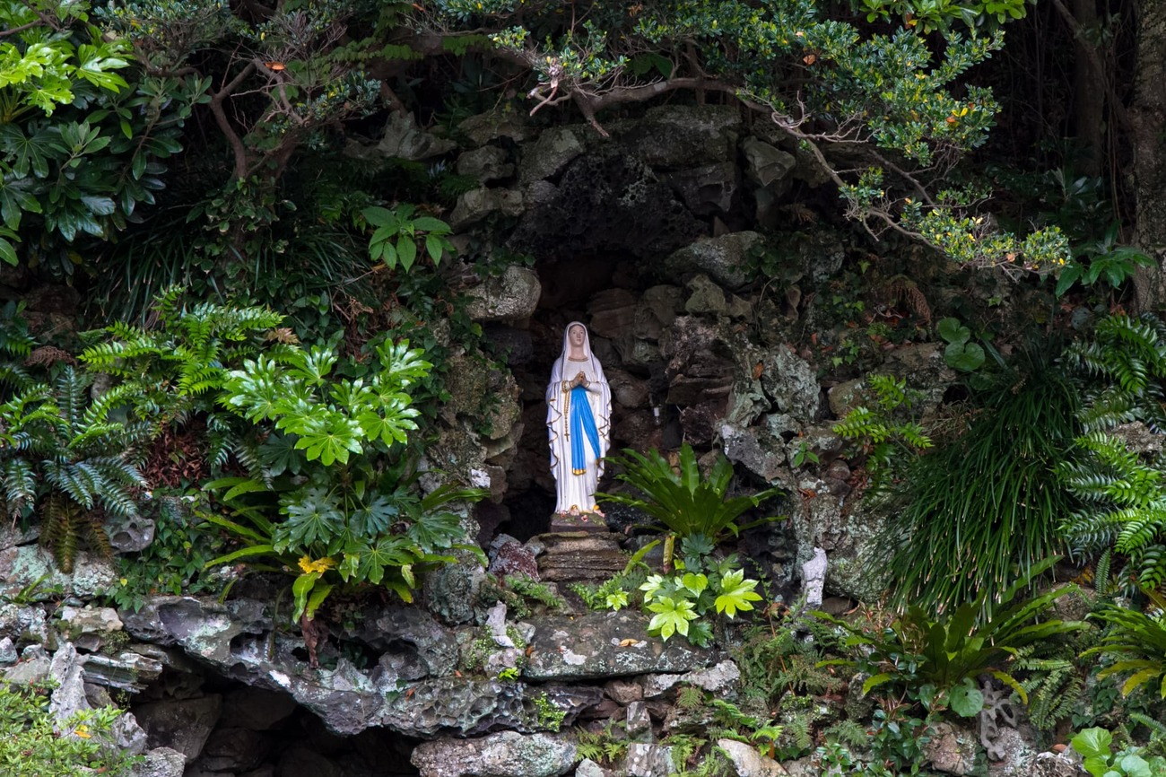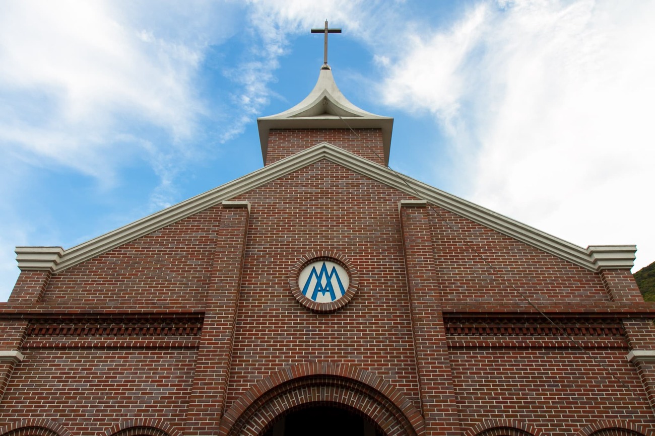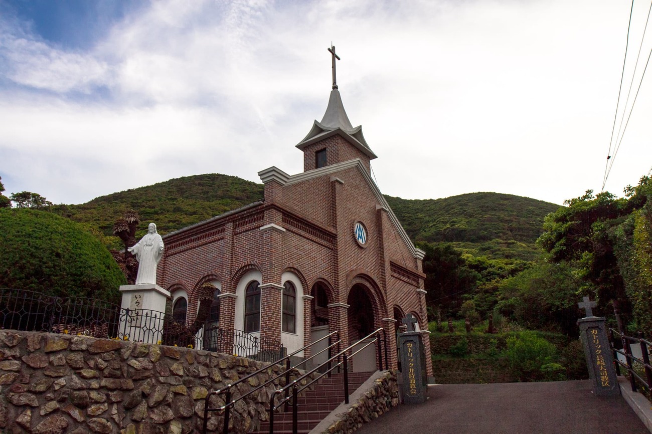 島の南西部、玉之浦町にある「井持浦教会」へ。もとは明治期創建のレンガ造り教会でしたが、1987年に建て替えられた現在の姿も風格があります。日本初の「ルルドの泉」が作られた教会としても知られています。
