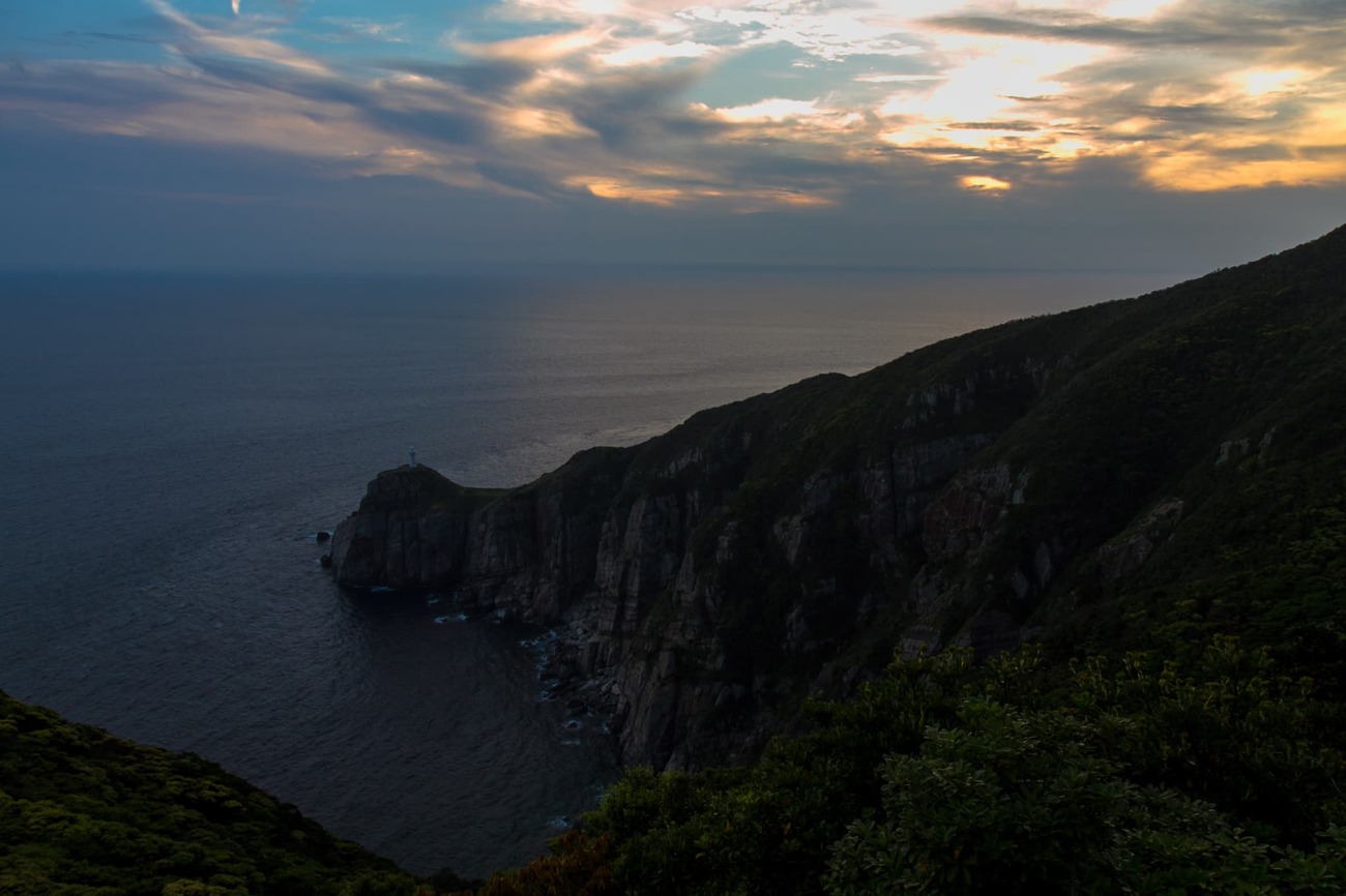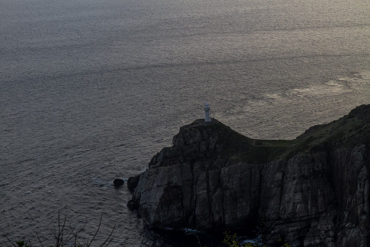 井持浦教会の近くからつづら折りの道を車で登ると、目的の大瀬崎の展望台に出ます。東シナ海の大海原に突き出た大瀬崎の上に立っているのが「大瀬崎灯台」です。日が暮れる前に間に合ってよかった。まるで灯台を置くためにあつらえられたような岬に、白い灯台が暮れゆく空の下で海を見下ろしています。しばらく眺めていたくなるこの灯台は、「日本の灯台50選」にも選ばれているそう。