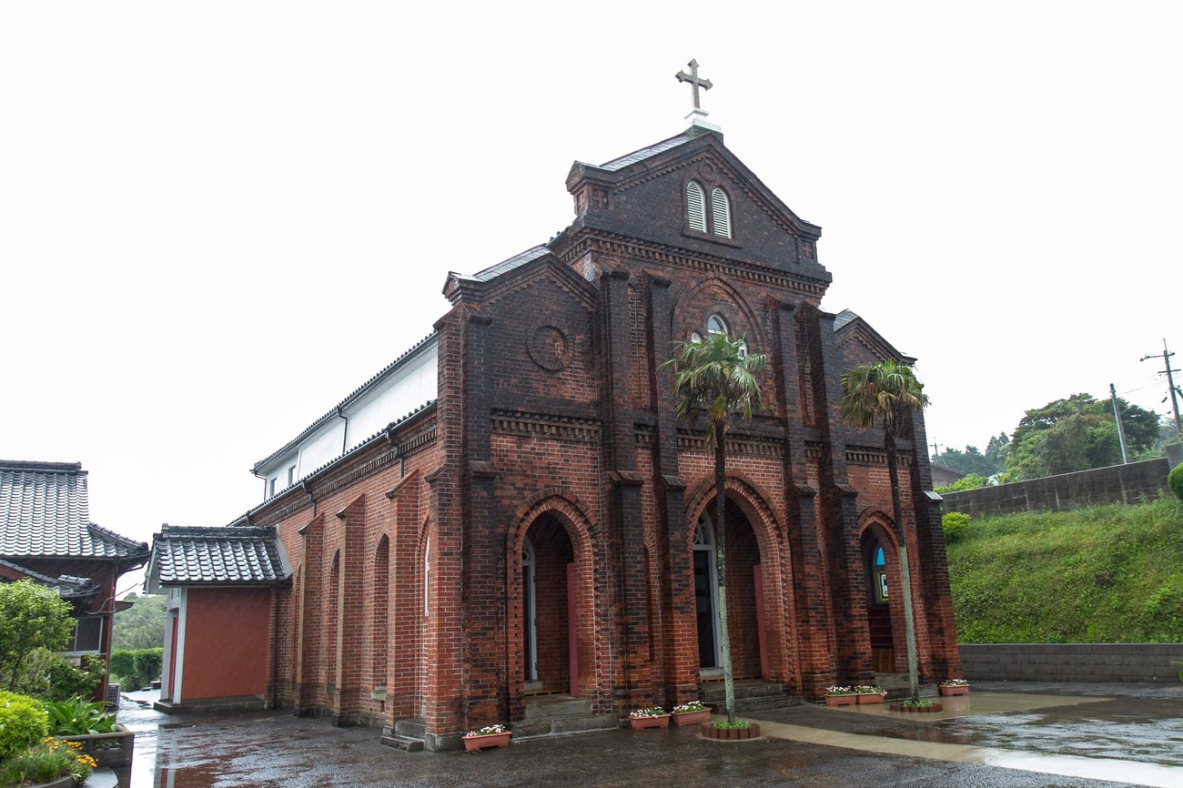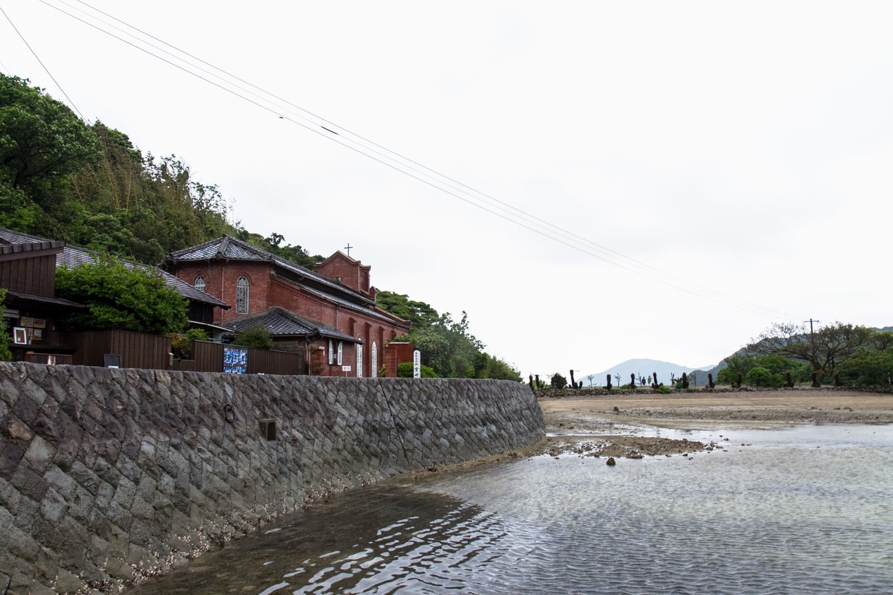 続いて「浦頭教会」、そして五島初の洋風建築である「堂崎教会」へ。潮の引いた入江沿いの小径を行くと、レンガ造り・ゴシック様式の教会が見えてきました。1908(明治41)年に完成した堂崎教会は、教会建築の父とも呼ばれる鉄川与助と、師である野原与吉の施工で建てられました。一度改修を受けていますが今も当時の姿を残しており、漂う風格はさすがの一言。県の有形文化財にも指定されています。
