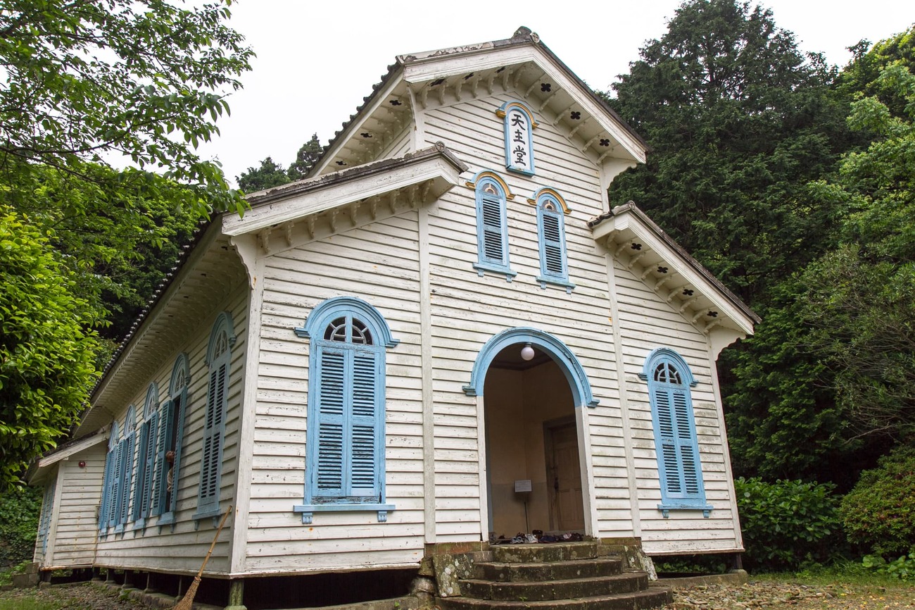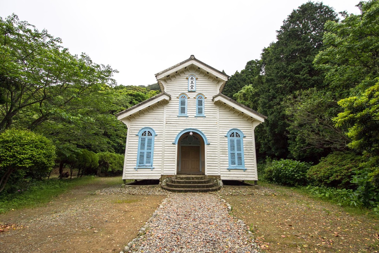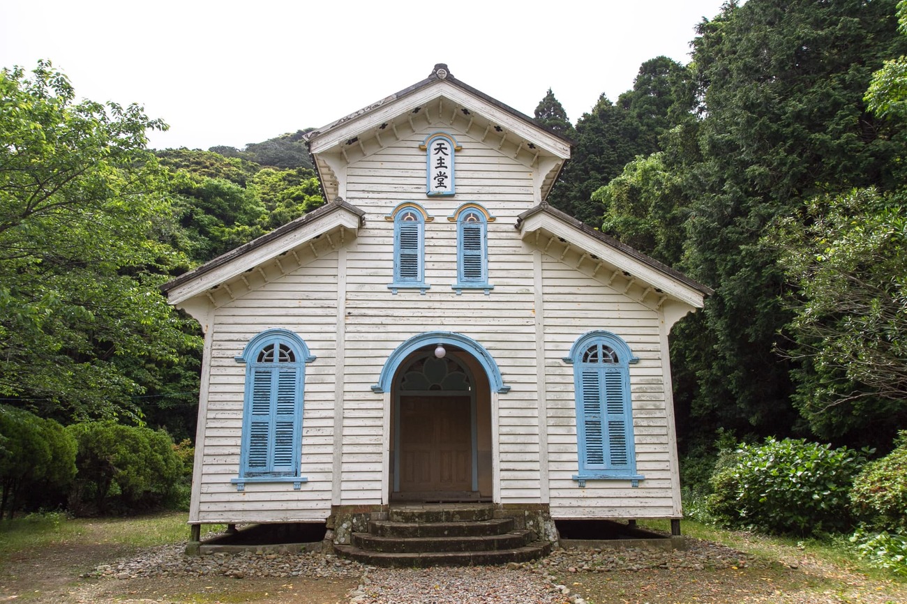 奈留島港から原付で20分ほど、山を越えた廃校そばの林の中に、「江上天主堂」はありました。周囲を木々に囲まれ、近くの小川を流れる水の音が絶えず聞こえてきます。白かと思った壁は近づくとクリーム色でした。水色の窓が掛けられた小さな木造教会は、物語の中から出てきたような姿です。この教会も鉄川与助の設計・施工で、1918年に建立されました。林や川がある湿気の多い場所で、100年もこの姿を保っていることに驚くばかりです。