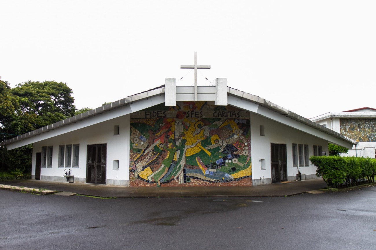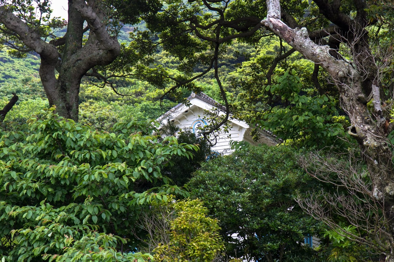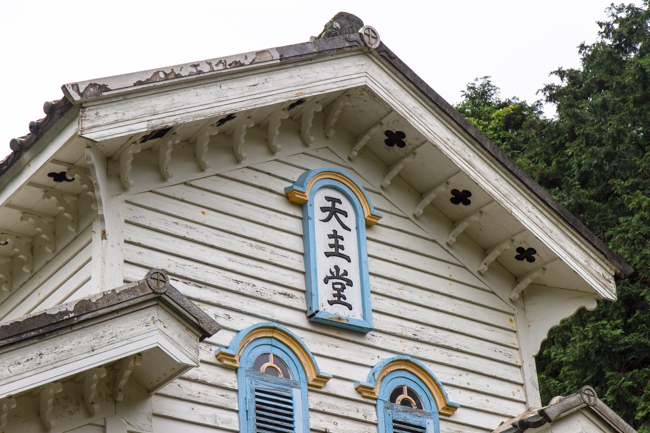奈留島港から原付で20分ほど、山を越えた廃校そばの林の中に、「江上天主堂」はありました。周囲を木々に囲まれ、近くの小川を流れる水の音が絶えず聞こえてきます。白かと思った壁は近づくとクリーム色でした。水色の窓が掛けられた小さな木造教会は、物語の中から出てきたような姿です。この教会も鉄川与助の設計・施工で、1918年に建立されました。林や川がある湿気の多い場所で、100年もこの姿を保っていることに驚くばかりです。