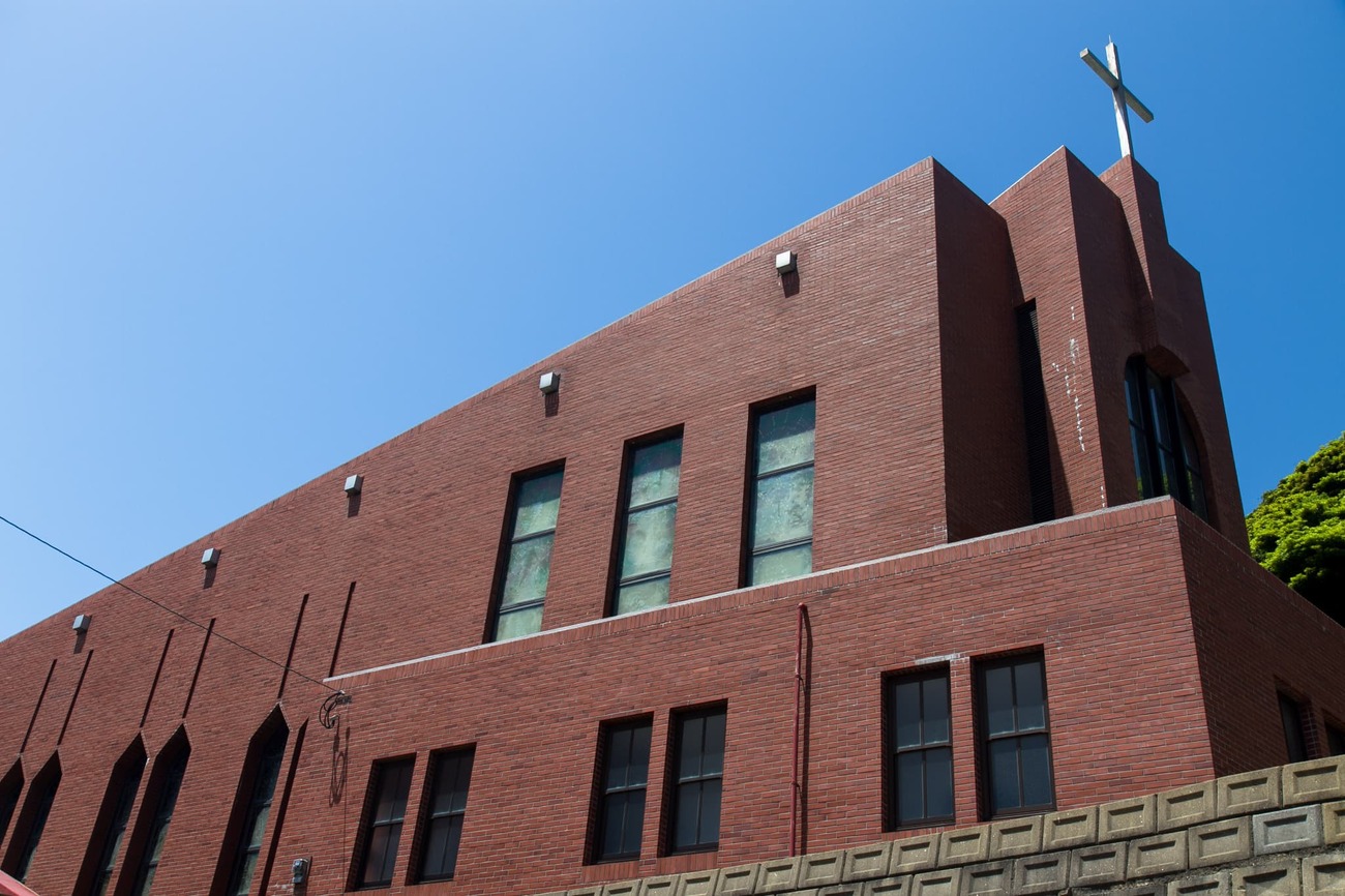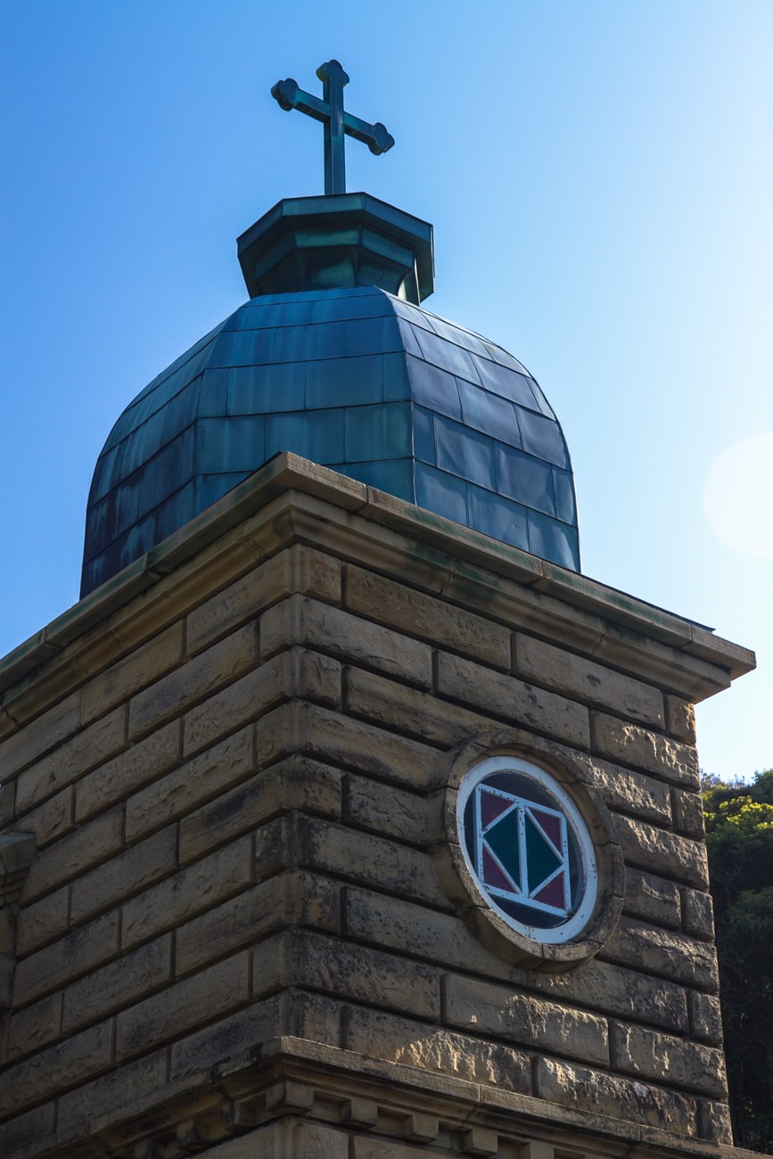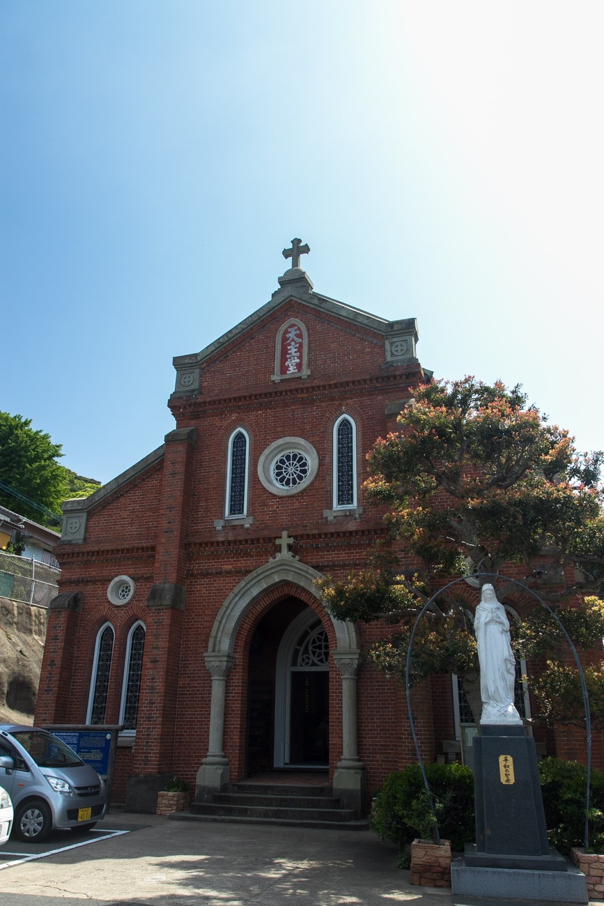 矢堅目から少し南に戻ってから、今度は島北部の新魚目地区へと続く道を進みます。左手に海を見ながら起伏のある道を進むと、堂々たるレンガ造りの教会が見えてきました。「青砂ヶ浦天主堂」です。教会では今まさに結婚式の最中で、入口から花嫁が新郎のところに向かう瞬間がちらっと見えました。邪魔しないよう、教会の建物を写真に収めて敷地を後にしました。ちなみに、この教会も鉄川与助の設計・施工。独立後に手掛けた3つ目の教会です。